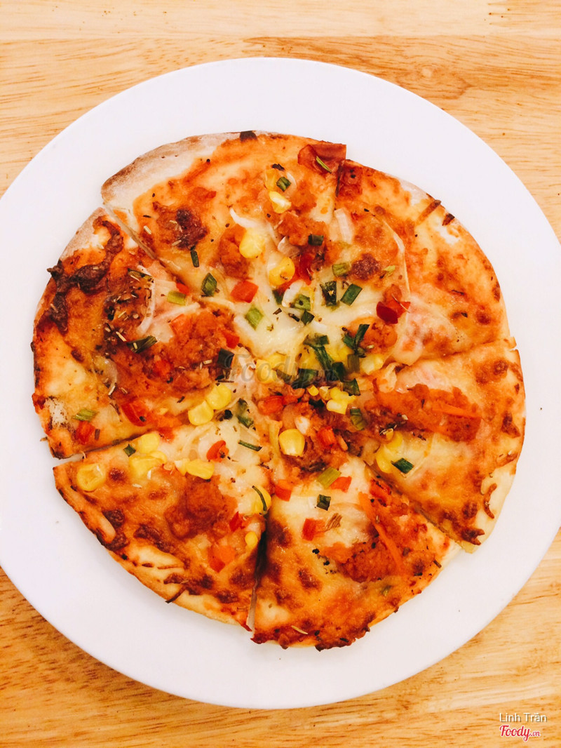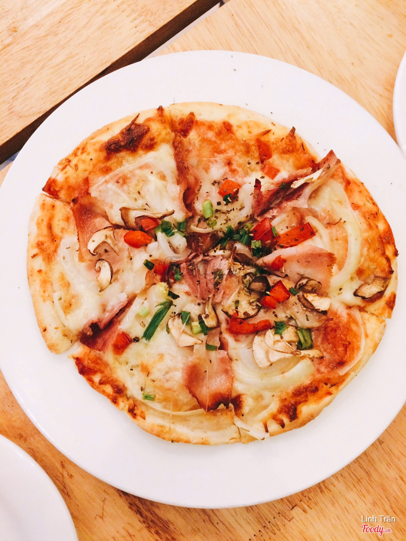 Đồ ăn: Mình gọi 1 pizza ông Tây và 1 pizza bò, đến lúc đem ra thì cũng không phân biệt được 2 loại vì nhân lèo tèo quá. Đế bánh khô cứng nhai muốn trẹo cả răng, mà phần lớn cái bánh là đế rồi. Chưa bao h ăn pizza ở đâu chán như chỗ này. 2 cái pizza bé tý mà bọn mình trầy trật mãi mới ăn xong. Sợ luôn.