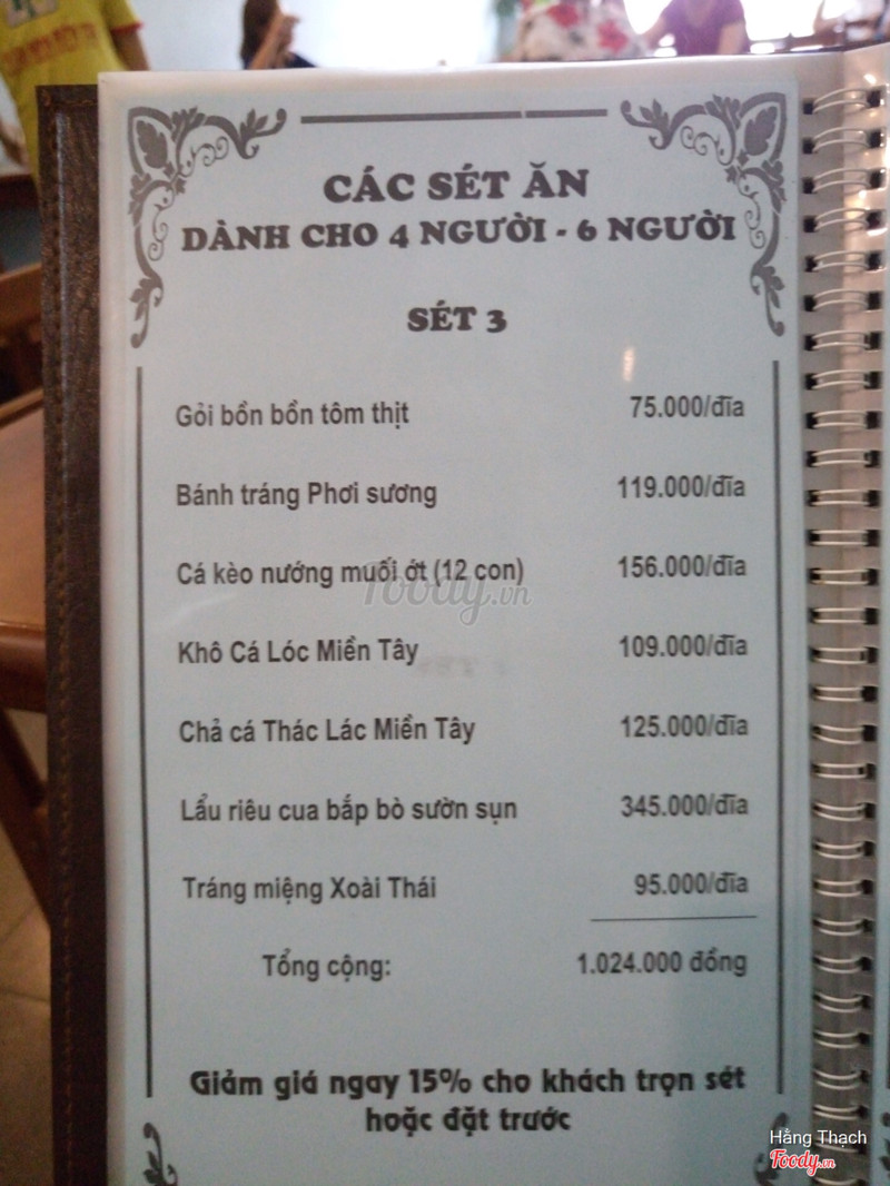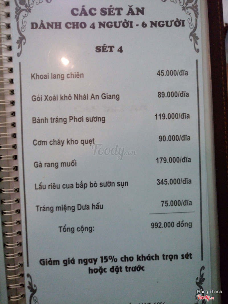 Có một số cái thế này: 2 đĩa thịt heo khoảng 7-8 miếng/đĩa nói quá chứ dày hơn lá lúa chút và nham nhở + để đông lạnh, ko ngon. Một đĩa dưa chua ko kêu nhưng vẫn để ra, có gắp thử 1 miếng cà rốt thái sợi thấy quá chua nên ko động nữa, tính tiền 30k. Ko thấy phục vụ nước xin 1 cốc nước lọc mang ra 1 chai lavie tính tiền 10k: vấn đề ở chỗ chai đã mở rồi (tưởng nước của cửa hàng ai ngờ lúc đọc bill tính tiền). Cháy kho quẹt tạm được nhưng yên tâm là quẹt mặn và gắt hơn cả nước mắm. 2vc + con gái 3 tuổi kêu: 2 đĩa thịt heo cuốn như đã nói ở trên, 1 bát con súp gà ngô cho bé, 2 cái bánh đa ăn chơi tự mang ra mình dùng (ok), 1 đĩa dưa tự mang ra mình ko dùng, 1 lavie đã mở nắp, 1 chai bia saigon, bát và đĩa thì sứt mẻ Tất cả 445k. Rất ko hài lòng.Xem thêm- Đây là nhận xét từ Thành Viên trên Foody, không phải từ Foody Corp. -