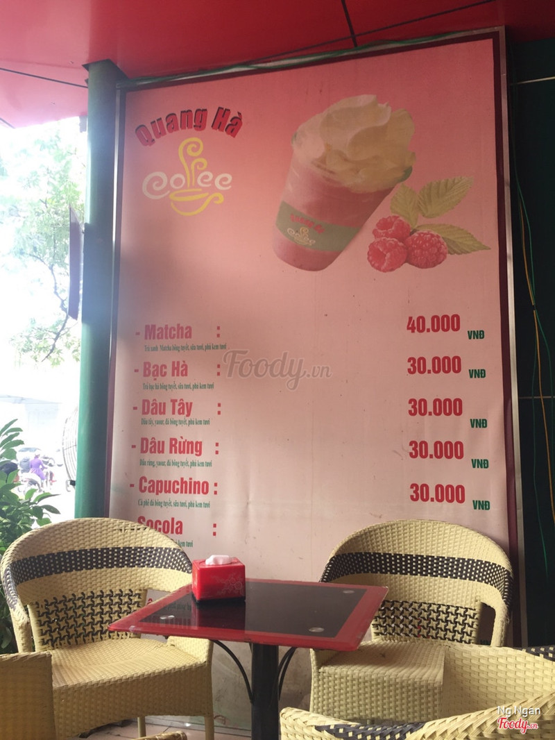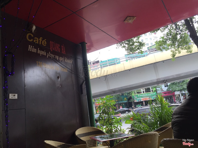 6.8Quang Hà Coffee - Nguyễn Chí ThanhQuang Hà coffee. Vị trí quán nằm ở dưới chân cầu vượt nguyễn chí thanh giao cắt với trần duy hưng. Ví trí khá đắt và đẹp, nhưng với không gian quán kiểu kiểu như thế này thì nói thật là quán sẽ thích hợp với các anh hút thuốc và hội ham mê bóng bánh cafe, và đúng như thế thật luôn. cứ mỗi một lần có bóng đá trận nào hay hay là y rằng quán đông như trảy hội kaka Mình thì được mời cafe ở đây nên cũng không có quá nhiều bình luận cho quán. quán cafe truyền thống nên là nên gọi các món có liên quan đến cafe rang xay truyền thống. Mình gọi bạc xỉu, uống khá oke. giá cũng không đắt, rơi vào tầm 20-30k cho 1 đồ uống. ...Xem thêm