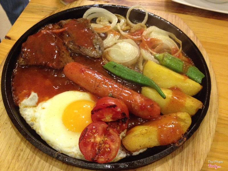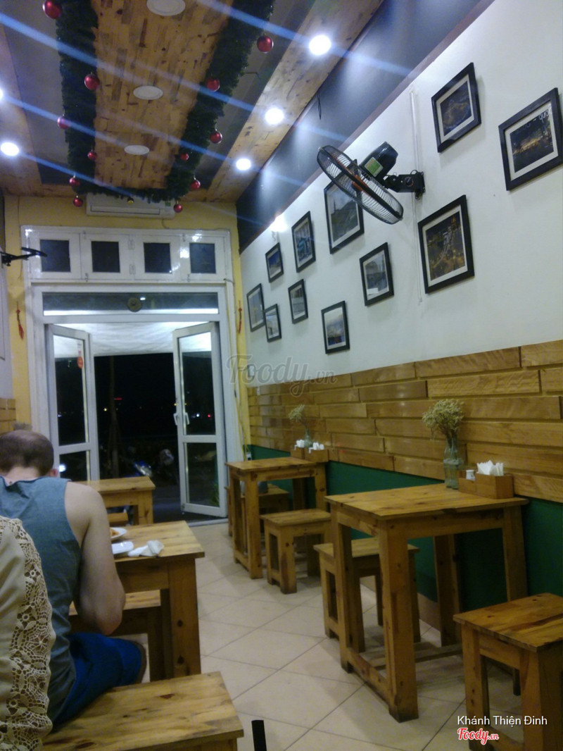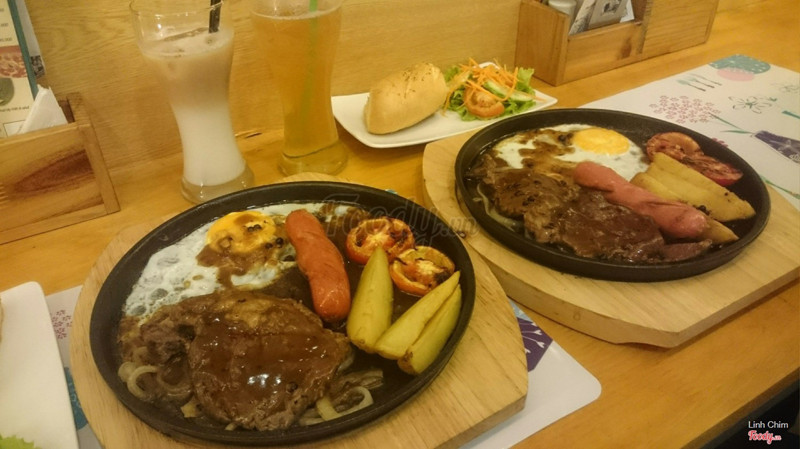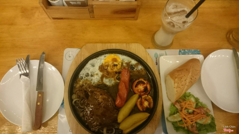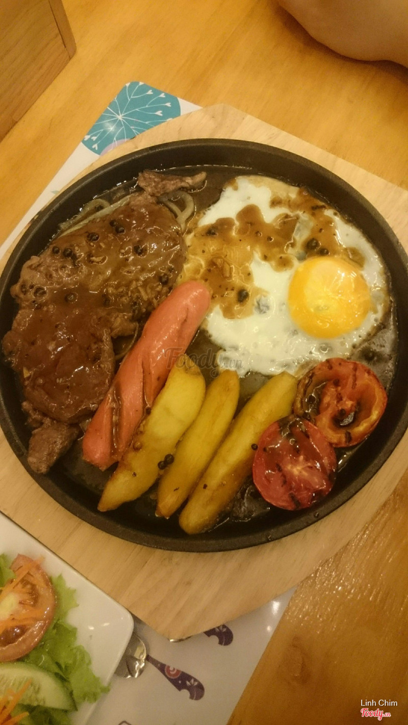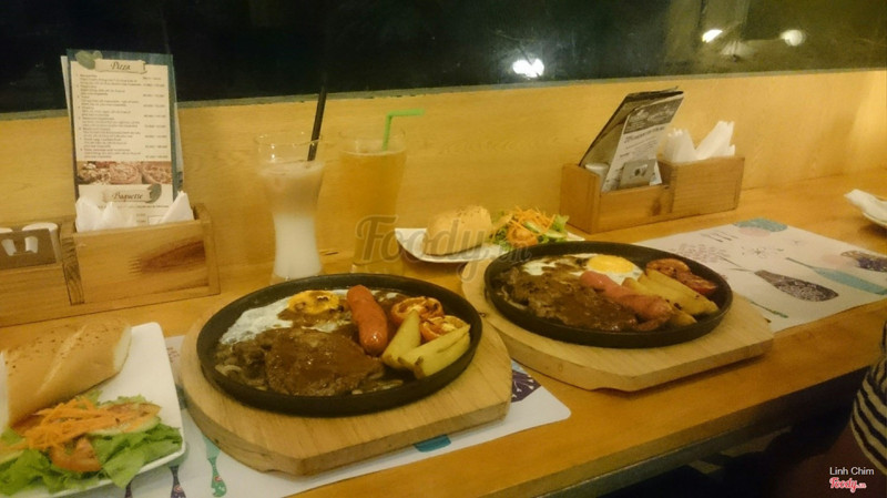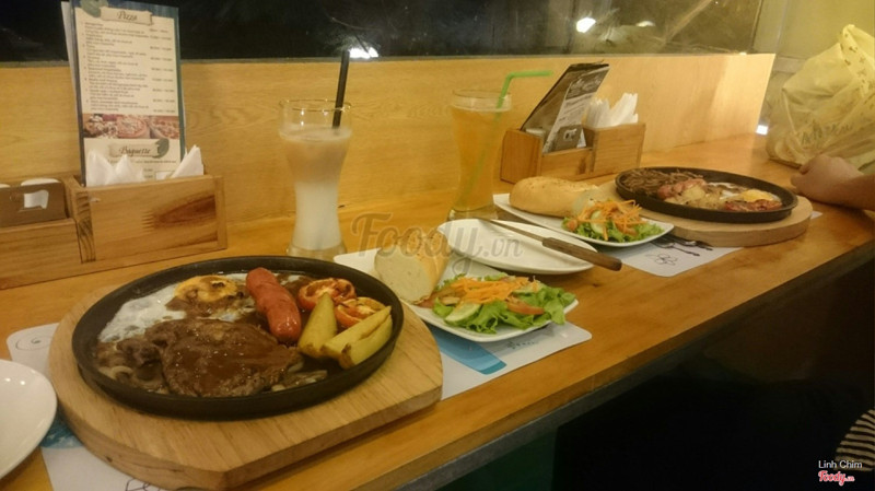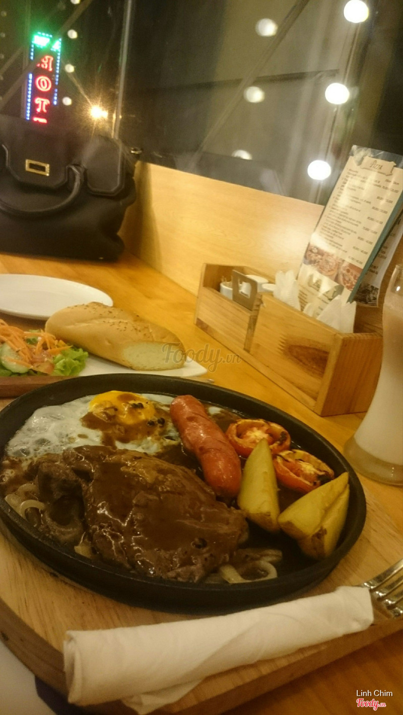 6.4Ăn tàm tạmQuán vắng, không biết có phải mới mở không vì hôm mình ăn có mỗi mình và em mình. Không gian tầng 2 đơn giản nhưng đẹp, vắng khách nên ngồi khá thoải mái. Mình mua voucher Hotdeal nên mới qua đây ăn, có: chảo bít tết, sườn nướng, súp bí ngô và brownie. Cảm nhận là nấu tàm tạm thôi, không ngon lắm, nếu không phạir mua deal thì chắc không nên ăn đâu. Súp bí ngô nấu với kem béo, ngậy. Bít tết nấu kiểu Việt Nam lắm, ít nữa. Sườn nướng thì nhạt chả có vị bbq gì cả. Mình phải chấm với sốt trước đos ăn bít tết hoặc ketchup mới ăn nổi. Suất bé tẹo nên lại phải gọi thêm pizza thì sợ luôn vì đế bánh ăn như bột cũ ý. Mình cũng từng làm pizza ăn rồi nên biết, hic. May mà mua 1 tặng 1 không thì đúng phí tiền. Voucher cuối tuần phụ thu 20k nhé. Brownie có kem ở trên, rưới 1 lớp sô cô la ở trên thì ko hiểu sao nó cứ chua chua cái lớp đó. Brownie chắc bé bằng 3 ngón tay, ăn 2 miếng là hết. Thôi mua voucher nên chỉ được vậy. Chán! Được cái cô ca ko đắt như chỗ khác. ...Xem thêm