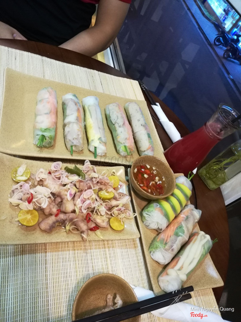 9.4Quán mới, không gian siêu đẹp!Tan làm đi về ngang qua cửa hàng thấy đập vào mắt cái poster to đùng, khuyến mại khai trương giảm giá 40% đến hết tháng 9, nên mình với đứa bạn rẽ vào thử quán mới ngay. Quán ở ngay đầu ngõ 60 Nguyễn Lương Bằng, từ ngoài đường lớn đi vào 20m là đến. Chỗ để xe ngay trước cửa hàng, trên vỉa hè nên hơi ít chỗ. Bước vào quán thấy dễ chịu cực, quán có chỗ rửa tay với quả gương hơi bị thần thánh, soi vào chả hiểu sao thấy xinh thế :))) background đèn đuốc lung linh là thấy rung rinh rồi :))) Order đồ ăn với nước ở quầy tầng 1, mình chọn nước ép Summer mix táo với dứa, bạn mình gọi Pepsi. Lên tầng 2 không gian rộng rãi hơn hẳn, cảm giác như lạc vào Hội An ấy :)))) tường sơn vàng, đèn cũng vàng, rèm là mành tre, phía tường ngoài là kính, nhìn ra đường phố bên ngoài nên cảm giác ko bị bí. Bàn ghế gỗ kiểu cổ điển, ko nhiều lắm, chỉ 3 bàn 4 người và 3 bàn 2 người. Trên tường còn có giá sách gỗ chạy dài, chắc để đọc trong lúc đợi đồ ăn lên :)))) Bọn mình thử mấy loại cuốn, cuốn bơ gà, cuốn chay, cuốn tôm, phở cuốn bò... Đồ lên hơi lâu 1 tí, vì khách order xong mới cuốn. quầy chế biến ở ngay cạnh cửa, có thể nhìn thấy luôn, khá sạch sẽ. Khay sạch, đũa bọc giấy ăn cẩn thận > đánh giá cao nè! Cảm nhận về đồ ăn: tươi, thanh mát, tôm - thịt - gà đều chất, ăn đã miệng chứ ko hời hợt lèo tèo. Mình thích nhất cuốn chay, có món nấm đùi gà siêu ngon. Cuốn bơ gà ăn cũng thích lắm. Nước chấm thì có 2 loại: nước mắm truyền thống với mắm - tỏi - ớt - hành lá (nhưng với mình thì hơi bị mặn vì có thể là do mình ăn nhạt) và sốt bơ lạc -> tưởng ngấy và béo nhưng thực chất lại ko hề, ăn lạ miệng, mình xin thêm 1 lần nữa ^_^ Đồ uống thì nước ép mix táo - dứa của mình vị thanh mát cực. Mỗi đứa một set với 1 đồ uống là đủ cho bữa tối. Tưởng ko no mà lại rất vừa vặn :D Nhân viên chu đáo, ân cần. Anh zai mang đồ lên cho bọn mình cười tỏa nắng mùa thu luôn :))) Lúc thanh toán tiền hơi lẻ 1 chút, anh ấy còn khuyến mại luôn cho cơ :D > Mình thấy khá hài lòng: không gian, nhân viên, chất lượng đồ ăn... Lên đồ nhanh hơn 1 tí và nước chấm rõ vị chua cay mặt ngọt hơn thì không có gì phải phàn nàn nữa :D ...Xem thêm