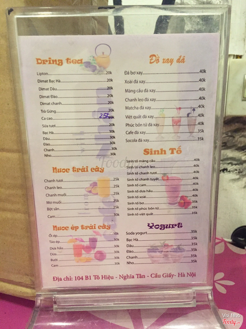 7.8Quán mang lại cảm giác ấm cúng và thân thiện25k cho một bình Ahmad đào to oạch mà lại còn có cả đào miếng nữa. Quá ư là ngon, bổ, rẻ. Nước ép hoa quả tươi ở quán khá ok, thơm ngon, cảm thấy rất nguyên chất, đặc biệt là táo với dứa. Táo thì thơm vị táo Mỹ ko phải táo TQ, dứa thì thơm tự nhiên, ko bị mùi hương liệu. Menu phong phú, giá cả dao động từ 20-40k. Mặt tiền nhỏ lại vướng cây nên không gian vỉa hè hơi hẹp, tuy nhiên phố này lại có nhiều cây cối nên rất mát mẻ và trong lành. Không gian phía trong quán rất yên tĩnh, phù hợp cho những ai thích không gian riêng tư. Quán phù hợp cả cho giới trẻ và nhân viên văn phòng. ...View more
