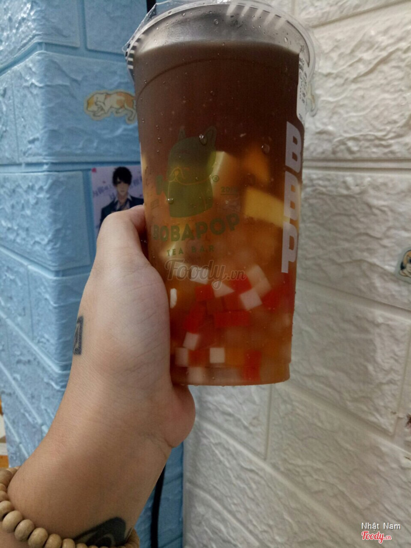 7.6Trà Sữa Bobapop - Thái HàBọn mình rất hay uống trà sữa nhờ đặt qua delivery now. Chị mình pick Bobapop, brand này giá rẻ sẵn rồi khỏi cần có code giảm giá nhiều như bên Royaltea. Royaltea giá khá cao. Bobapop rẻ hơn mặt bằng chung khá rõ rệt. Trà vải thêm thạch phô mai cùng hạt trái cây và hạt nha đam. Trời ơi đến cái lúc cốc trà về tay ta nói nó y như cốc chè :)) cái tội ham rẻ nên add lố 3 loại topping luôn. Mà cũng ngon nha chứ không phải không. Trà bóng mưa thêm thạch sô cô la, thạch cà phê, hạt trái cây và hạt trà xanh. Cốc này còn giống cốc chè hơn:))) giá rẻ, chất lượng ổn. Đóng họ Bobapop 4 năm rồi ý. ...View more