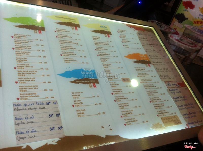 7.0Quán xingcha ưng ưng👌👌Quán nằm gần cầu vượt nguyễn chí thanh,nhìn phát thấy ngay màu đen ở bên phải đường.Nhân viên thì được,nhiệt tình.Quán có 2 tầng. -mình chọn trà hoa nhài uống thanh nhẹ mát,hơi đắng chút.còn socola thì hơi ngọt,gần cuối đá n tan ra uống như nước lọc.có chương trình mua 2 tặng 1 thì mình chọn trà ô long uống cx bt. -lúc về nhân viên cảm ơn rất được.có a nhân viên dắt xe tận tình quá👌👌 -không gian:hoa quả trông rất đáng yêu hihi:))) -giá cả:cũng gần bằng dingtea ...Xem thêm