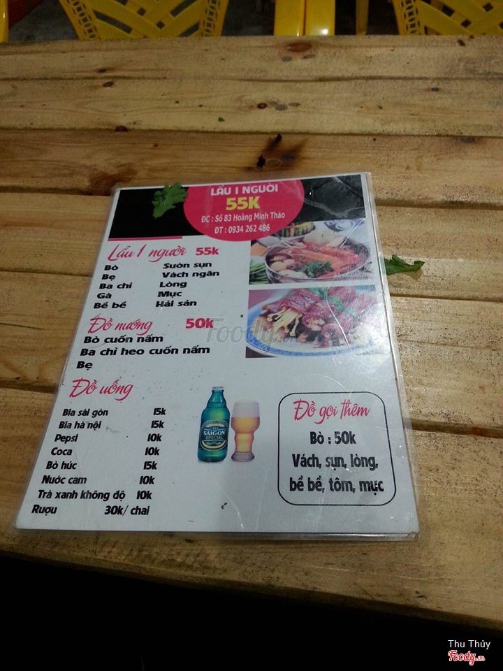 8.4Hà Vy - Lẩu 1 NgườiNọ thèm ăn lẩu mà vào đúng dịp lễ tết thành ra đi lung tung mà chả thấy quán lẩu 1 người nào còn slot cả hiu hiu. Thế là ghé qua Hoàng Minh Thảo thì thấy quán này còn chỗ liền ghé vào liền :)). Quán nằm ngay mặt đường Hoàng Minh Thảo thui ạ, rất dễ tìm, mặt tiền rộng rãi. Không gian rộng rãi, nhiều bàn ghế, mỗi tội ngồi ghế nhựa nên mình không thích lắm. Quán có bán lẩu 1 người giá 55k thui ạ, ăn khá ngon, nước dùng ngon ngọt. Nhân viên khá nhiệt tình, chuẩn bị đầy đủ các loại gia vị luôn, chỉ là làm hơi chậm xíu, nhiều lúc mình gọi rồi còn quay lại hỏi mình thêm vài lần nữa @@. ...Xem thêm
