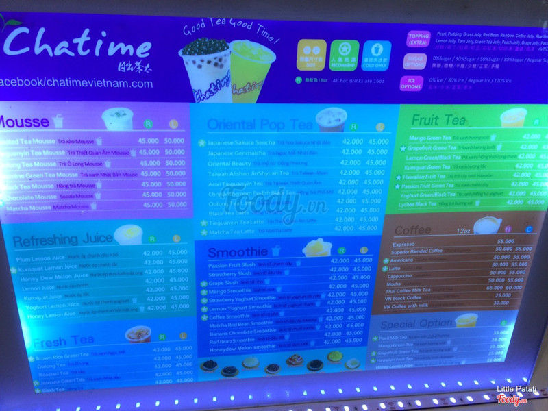 3.4Chat timeĐịa điểm tầng 2 của vivo, rất vắng vẻ. Ngay chỗ game center với các quán ăn khác nên đi lại khá nhiều. Ghế đẹp, màu tím, ngồi êm ái. Nhân viên lạnh nhạt, không hỏi mức độ đường đá dù được oder theo cách đó nên trà sữa mình oder ra lạt nhách, chỉ có trân châu là ổn thôi. Vì trân châu nên mình mới uống lại :)) Một ly tầm 57k trở lên, mắc hơn cả gong cha @@ :(( Nói chung là tệ so với 1 quán trà sữa nước ngoài. ...Xem thêm