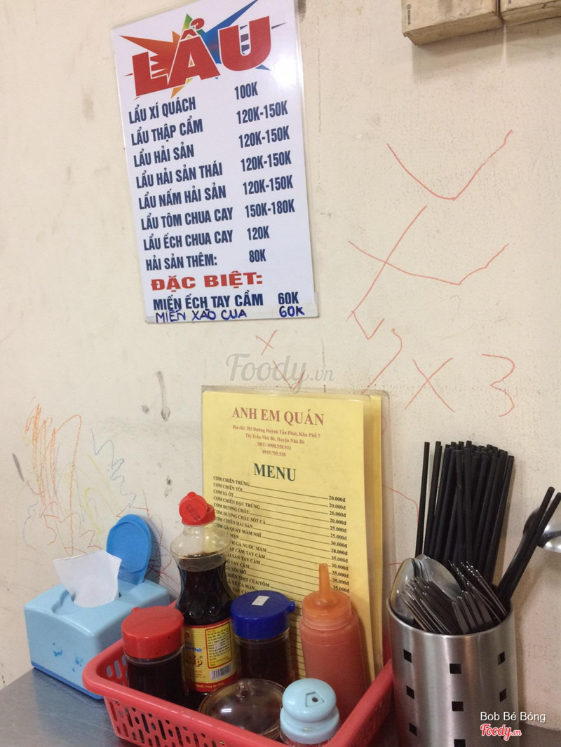 7.4Anh Em Quán - Hủ Tiếu Xào & Cơm GàQuán cơm gần nhà bạn gái , ăn ok nhất món cơm gà quay mắm nhĩ , giá ok , kêu thêm 2k cơm cho chẵn 30k cũng đủ no . Trà đá quán free , vô ngồi là bưng ra ngay . Nhân viên không đông lắm , tầm 3 - 4 người mà nấu và mang ra vẫn nhanh gọn . Quán bán rất nhiều món , menu nhìn vô rất đa dạng . Giữ xe trước quán . Nhiều khách quen , mua mang về cũng nhiều , mỗi phần ở đây đảm bảo 1 khách ăn no ...Xem thêm