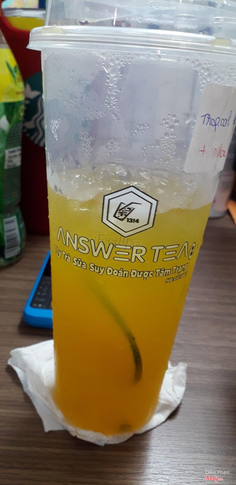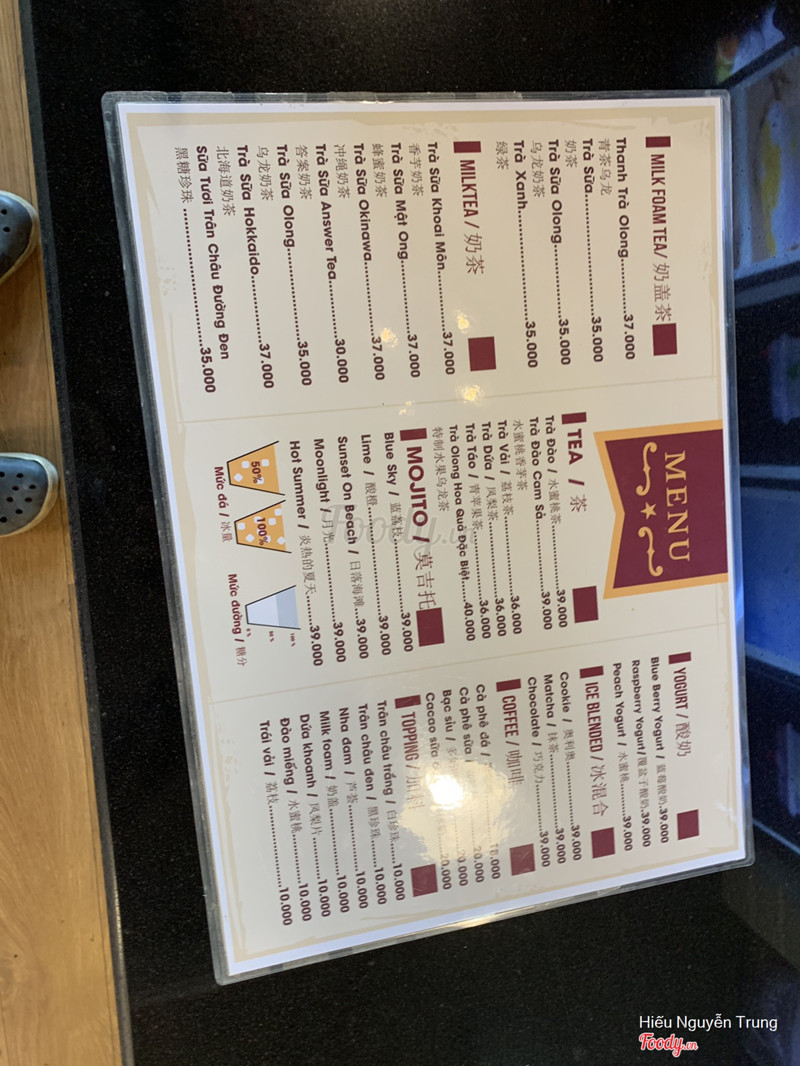 8.0Answer Tea - Hồng BàngMình có order Olong Hoa Hồng Hương Sữa Giáng Hương, Trà Xanh Chanh Nhài Nam Dương, Trà Hoa Quả Nhiệt Đới Nam Dương, 3 món chắc ưng ý hết 3 luôn nè. Trước tiên phải nói là giá ở đây khá rẻ, phù hợp với nhiều bạn sinh viên, giá chỉ từ 28k-43k thôi. - Olong Hoa Hồng Giáng Hương: trước tiên phải dành lời khen cho lớp kem chesee, đặc nhẹ, mịn màng lắm nha. Vị trà thơm nhẹ, thoang thoảng mùi hoa hồng. Bạn nào muốn in hình thì chỉ thêm 5k thôi, quá rẻ luôn. Nhớ chuẩn bị hình xinh thiệt xinh trước nhé :)) - Trà Xanh Chanh Nhài Nam Dương: vị trà thơm, dễ uống. Điều đặc biệt là món này pha với đá tuyết, khi uống quậy đều lên, uống vào sẽ có cảm giác đá tan trong miệng, kèm theo mùi chanh vàng nữa, đã dễ sợ. - Trà Hoa Quả Nhiệt Đới Nam Dương: bạn nào sợ béo thì cứ order món này nhé, vị trà thơm, kết hợp với trái cây tươi nên fresh lắm nè. Ly này thì có thêm topping trái cây tươi sẵn, bạn nào muốn add thêm trân châu trắng cũng đc nhé. Một điểm cộng cho quán là không gian khá rộng, thoáng, đơn giản nhưng nhìn khá ấm cúng. Chỗ này thích hợp cho mấy bạn học bài, họp hội chị em đều được nha :))) ...Xem thêm
