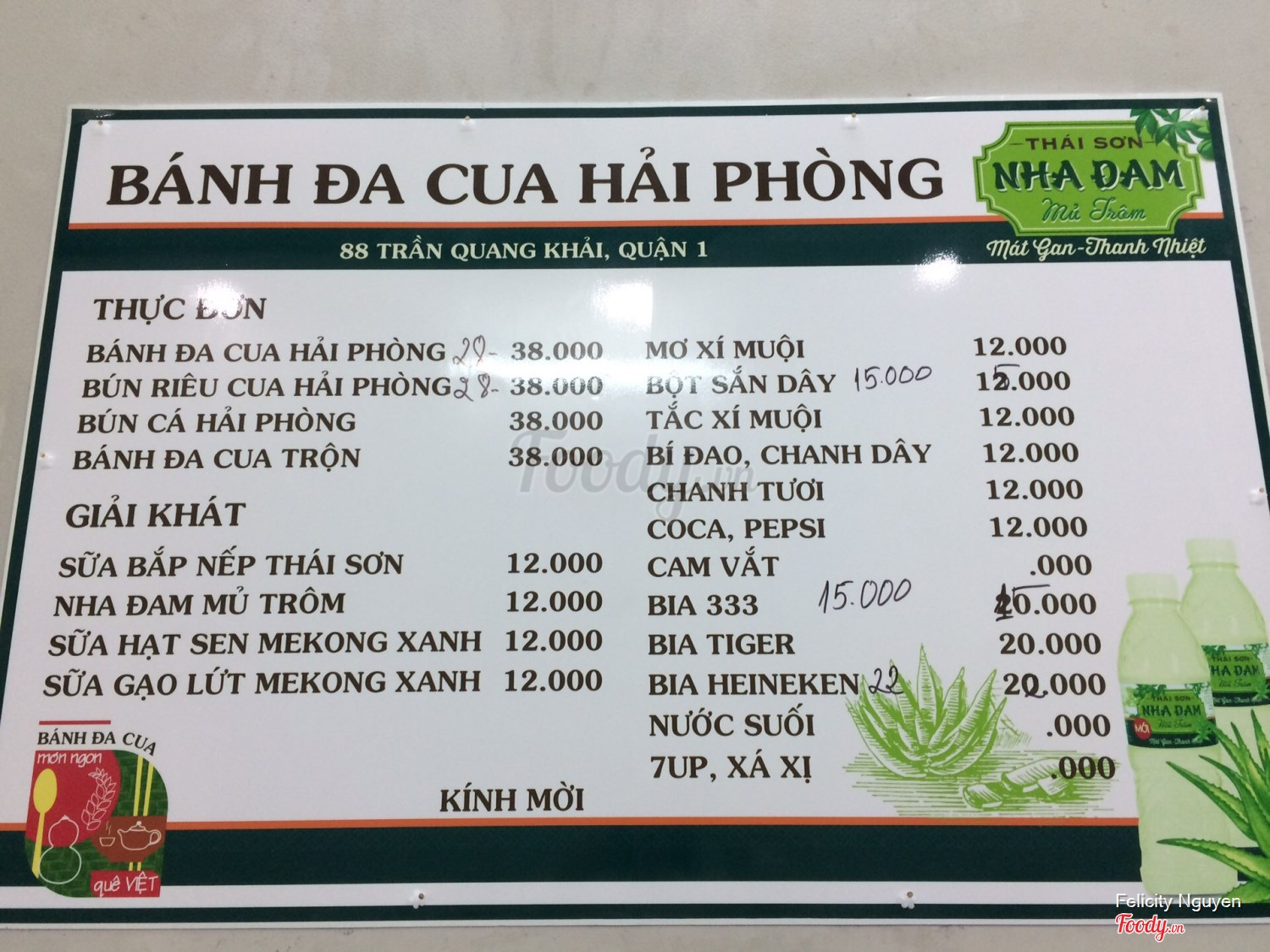 Bảng giá các món