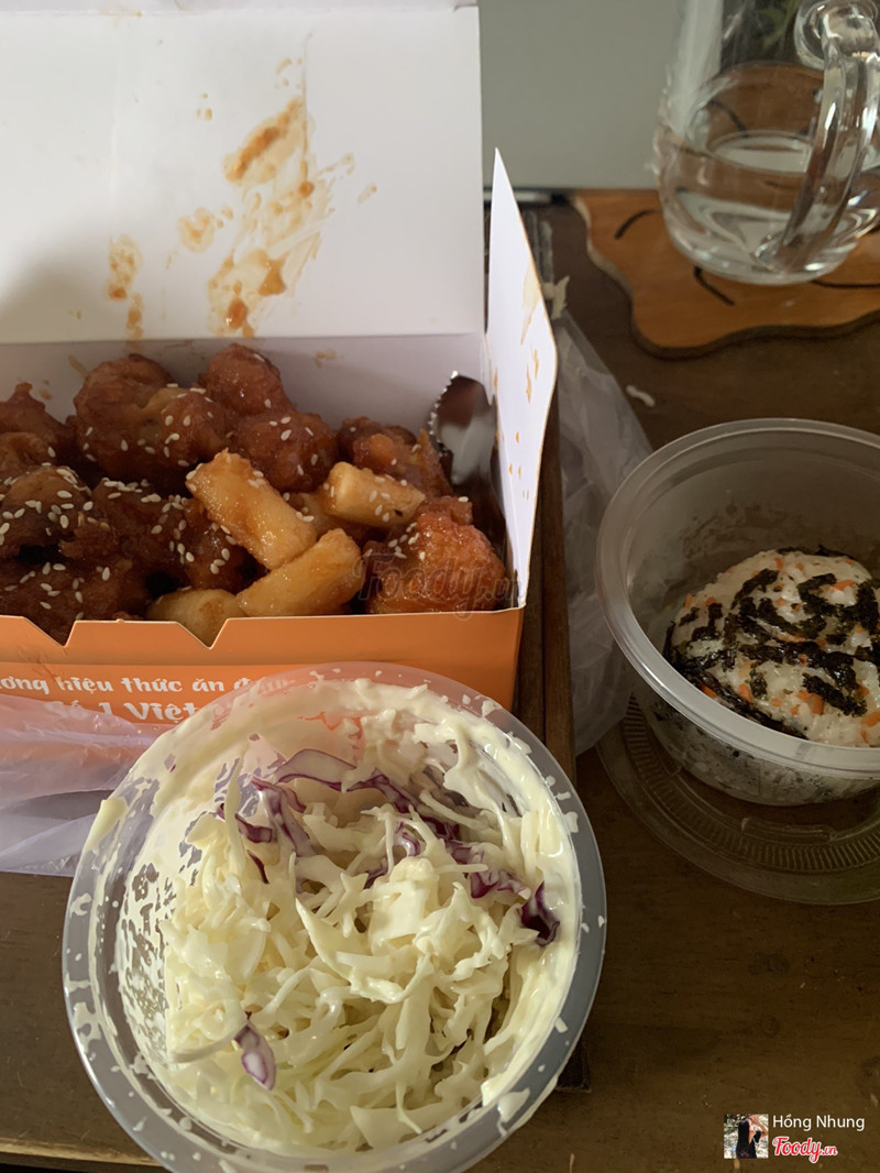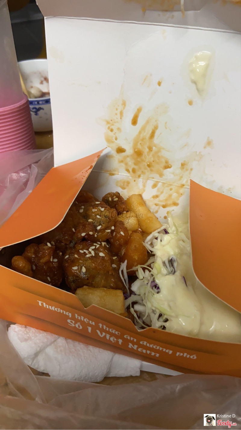 8.0ỔnĐặt lần t2 rồi mới lên đánh giá. Thèm gà rán nên lướt tìm trên grab thì thấy quán, nhìn qua giá khá ok còn có mã khuyến mãi nhiều nên mình đặt ăn thử. Mình đã thử 3 vị : Ngũ vị, sốt chua cay và sốt cay. Sốt cay hơi cay nồng mình không thích lắm, còn 2 vị kia thấy cũng khá giống nhau, không có gì đặc biệt nhưng ăn được. Gà tẩm sốt nhưng vỏ vẫn khá giòn, 1 phần size S khá nhiều, có cả tokpokki và salad ăn kèm ( salad nhiều, ngon ). Đặc biệt là mình rất thích cục cơm nắm :)) có 8k nhưng bự chà bá và có mùi giống xôi ( mình ko hiểu vsao nhưng thấy v), dẻo, ngon đúng kiểu mình thích, ăn 1 cục no lắm luôn. Vị gà thì ngoài phần vỏ vị vừa phải ra thì bên trong thịt gà ko thấm lắm, hơi nhạt, ăn kèm tương ớt thì ngon hơn. Đóng gói cũng gọn gàng, dễ thương. Túm lại là duyệt sẽ ủng hộ quán dài dài. ...Xem thêm