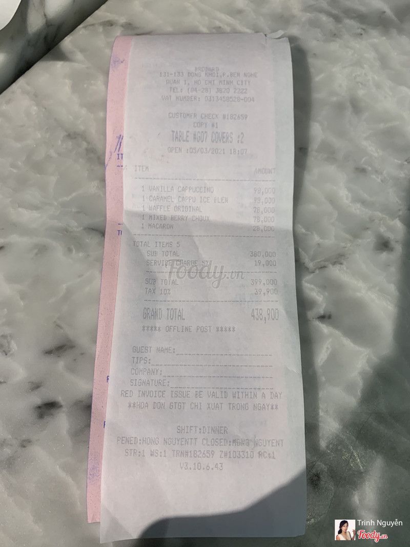 5.0Nhân viên không nice, không chuyên nghiệp. Tính tiền vô lýMình đã đọc được một vài bình luận không hay về chỗ này nhưng đi ngang thấy trang trí đẹp nên muốn một lần ghé qua. Nhân viên có thái độ không được dễ thương lắm. Lúc tính tiền thì tính service charge 5%, sau đó tính VAT thêm 10 % Trên cả service charge. Lần đầu tiên mình thấy có kiểu tính vô lý này nên thắc mắc với nhân viên. Nhân viên trả lời ghi nhận và không giải đáp được thắc mắc của mình nói là sẽ liên hệ sau nhưng cũng không thấy. Tuy không đáng nhưng nếu như giữ cách tính này thì rất là vô lý cho khách hàng nhất là những khách hàng sử dụng nhiều sản phẩm ở hệ thống. Bánh thì cũng không ngon lắm. Không đặc sắc nhưng giá không phải là thấp. Mình không định ghé lại đây lần thứ hai. ...Xem thêm