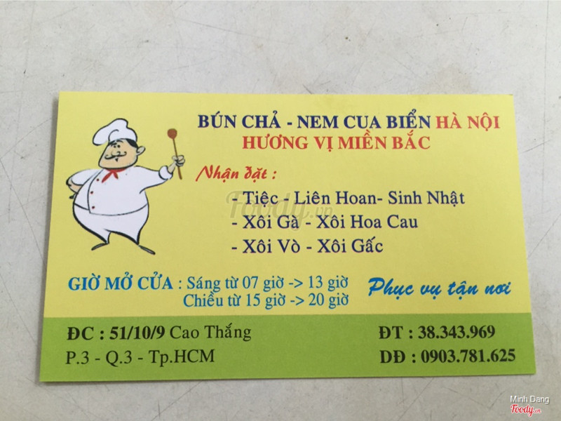 7.0Bún chả Hà Nội bí hiểmQuán này có cũng khá lâu rồi. Gọi là quán chứ vào ăn giống vào nhà bạn ăn cơm vậy vì quán bán theo kiểu gia đình. Chỉ có cô chủ và người giúp việc phụ nấu, dọn dẹp. Để vào đây ăn bạn nên đặt trước nếu đến đông người. Chả và thịt nướng home-made nên ăn khá ok, vừa ăn, thịt còn nóng hổi. Nước mắm nếu bạn nào thích ăn nóng thì báo cho cô để cô hâm nóng lên. Rau 1 dĩa nhiều và nhìn rất sạch sẽ. Chả Nem bắc cũng rất ok. Ăn sáng mình đi 2 người, 2 phần bún chả và nem hết 120 ngàn. Giá hơi cao chút nhưng thỉnh thoảng đổi gió được. Quán có giao hàng tận nơi luôn nhé. ...Xem thêm