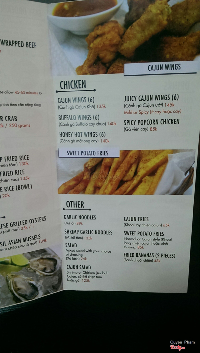 6.8OKCũng vì khuyến mãi khai trương mua 1 tặng 1 kg crawfish nên mới đi ăn thôi chứ mình chẳng khoái cái con tôm gì toàn vỏ cứng cái món gì mà ăn dơ kinh! 😂 (có người bóc vỏ dùm thì ăn 😋) Nói chớ, thích sốt cajun! Chấm bánh mì là nhất! Nói chung mấy con "cá biết bò" ở đây không được tươi và không to bằng ở Mỹ! Sốt cajun cay và mặn mà hơn juicy Món xôi cua ăn cũng ngon á! 👍🏻 Cánh gà buffalo là 1 sự thất bại nhẹ! 👎🏻 Location 👍🏻 vì gần nhà mình và cũng dễ tìm. ...Xem thêm