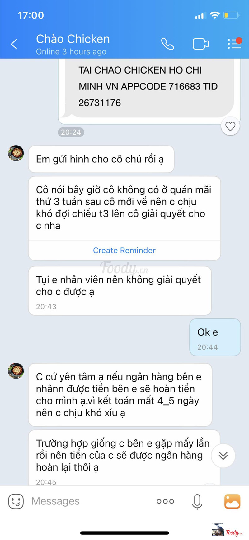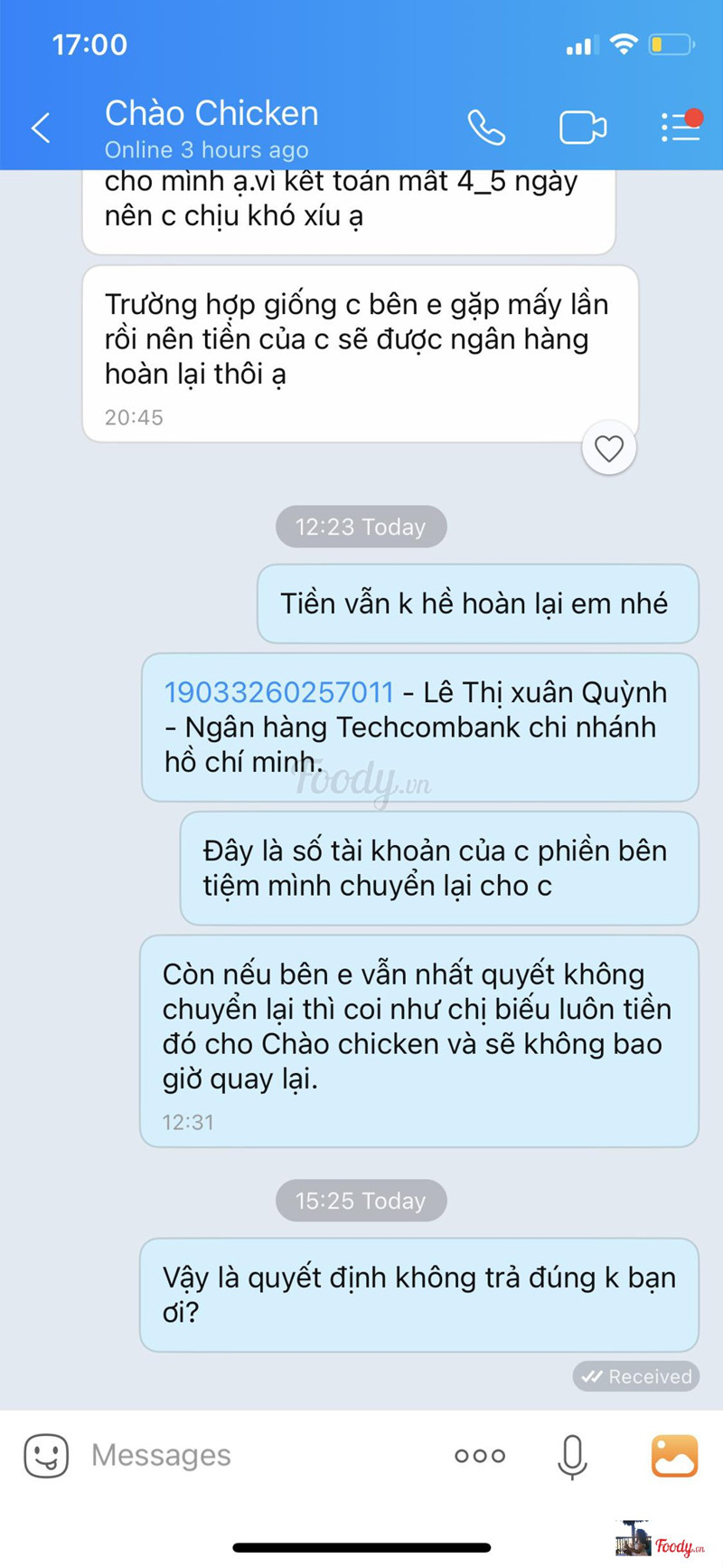 1.0Chào Chicken làm ăn quá mất dạy!Chào Chicken làm ăn quá mất dạy! Mình ăn ở đây cũng nhiều lần vì gà cay khá ok giá vừa phải. Tuần trước mình có qua ăn và trả tiền bằng thẻ, sau đó thẻ đã bị trừ tiền nhưng bên đó bảo giao dịch không thành công nên yêu cầu mình trả bằng tiền mặt. Mình hỏi là nếu vậy thì nếu tiền không hoàn lại thẻ thì sao, BẠN NHÂN VIÊN TRẢ LỜI NGÀY MAI NẾU CHƯA ĐC HOÀN TIỀN THÌ QUAY LẠI BẠN GIẢI QUYẾT TRẢ LẠI TIỀN. Tin tưởng nên mình đồng ý ngay. Sau đó mình nhắn tin cho Chào Chicken vì mình đã gọi điện qua ngân hàng, ngân hàng bảo giao dịch thành công.Thì bên đó bảo chủ quán thứ 3 tuần sau mới về, kêu mình đợi ngân hàng hoàn tiền. Hôm nay là hơn 1 tuần từ ngày hôm đó mình nhắn tin gọi điện nhưng CHÀO CHICKEN ĐÃ LỜ ĐI TIN NHẮN CỦA MÌNH TRONG KHI VẪN ONLINE. Mình upload cả số giao dịch của đợt đó luôn nếu mọi người sợ mình dựng chuyện ...Xem thêm