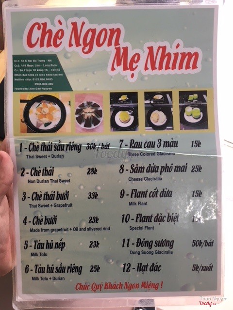 6.4Chè Ngon Mẹ NhímChè mẹ Nhím mình thích nhất là nước cốt dừa vị khá ngon dù là ăn nguội hay đá cốt dừa không bị vón cục lại. Ăn 1 tô là no bụng luôn. Mong mẹ Nhím triển khai món dừa dầm đang sốt ở Hà Nội và Sài Gòn. ...Xem thêm