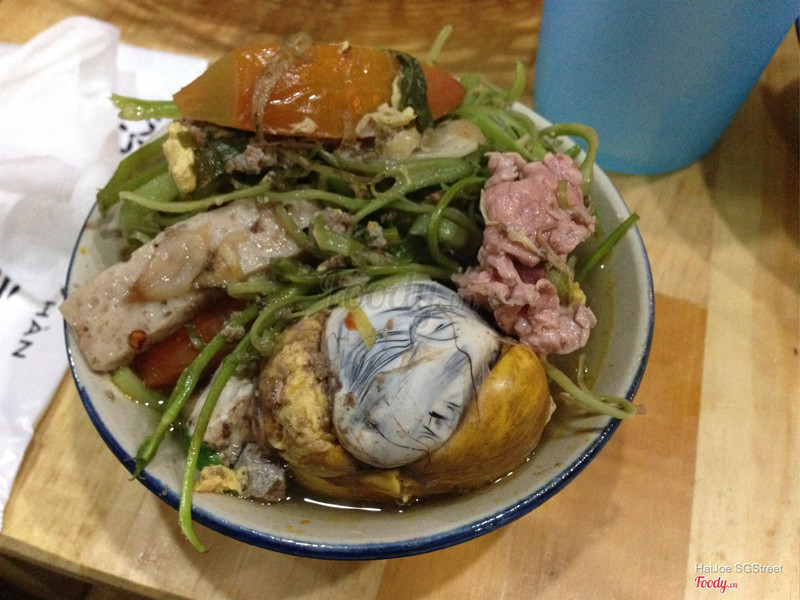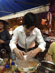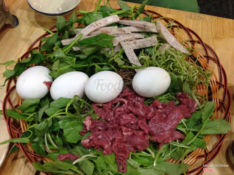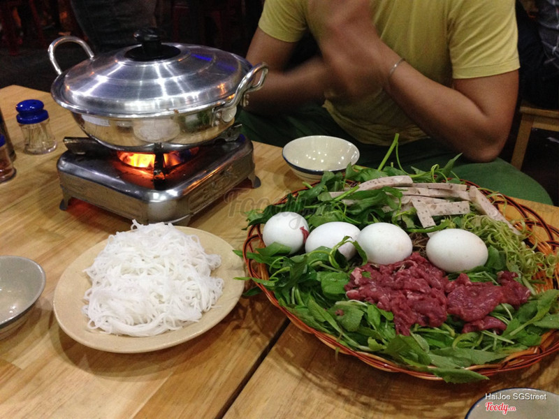 7.6Cô Khàn Đêm - Ăn Đêm Hàm NghiReplace that anticipated narrow dark alley with a great view Vietnam’s tallest skyscraper. And replace that old Vietnamese woman who had been tending her kettle for the past 40 years with one of today’s most popular Vietnamese models. It’s very nice to marvel from our little red plastic chairs at the splendor of the soaring Bitexco Financial Tower piercing the Saigon night sky with its 68 stories of bright lights. And it was great fun chit-chatting with Ms. Trang Trần, our celebrity Vietnamese restauranteer and hostess for the evening about how she found her staff on Facebook and runs a family-like business on Saigon’s streets. BUT, what about our lẩu (Vietnamese hot pot)? The lẩu was unique and delicious. An authentic “northern flavor” (as with authentic Hanoi-style lẩu). Not sweet, but mildly sour. A “quiet” nước lèo (soup broth). And, as with any great lẩu , lots of goodies to drop into the hot broth to cook at our table … bún (rice noodles), giò hủ (peppery and delicious Vietnamese pork sausage), rau muống (morning glory) and lots of other fresh Vietnamese vegetable and herbs. We ordered a generous pile of tender thịt bò (beef), as well. And then, there was a hột vịt lộn ̣(fertilized-duck-eggs) to add to the broth, one for each of us. I loved it, very delicious! BUT, a bit of advice here: I suggest that you ask your waiter to please do the honors of actually opening the fertilized duck eggs and dropping them into the steaming broth pot in the center of your table. (You actually might want to look away at that point since the sight of the not-yet-fully-cooked-fertilized-duck-eggs dropping into the broth can be a tad “bloody.” ) But, don’t think a lot about that. It’s an amazingly delicious meal. Opened less than a year ago, Cô Khàn Đêm is already very popular spot to enjoy Saigon street food in the center of town. Co Khan Dem menuA tad pricey by local Viet standards (certainly not by tourists price standards – we paid about 348,000 vnd ($16 USD for the 3 of us), this eatery is a perfect place to try authentic Hanoi-style hot pot, without ever leaving Saigon ...Xem thêm