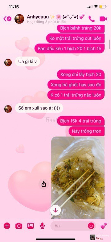 3.0Bịch 20k chỉ có btrang rau xoài đậu phộngChỉ biết số mình xui. Đến mua 2 bịch xong hồi lại lấy 1 bịch 20k thì bị dằn mặt bịch 20k ko bằng bịch 15k mọi khi mia đã vậy không có trái trứng nào chỉ có bánh tráng rau xoài đậu phộng . Mua gần chục lần r mà nay mới hồi lại 1 bịch cái làm vậy😭 chị trẻ bán không phải cô bán. ...Xem thêm