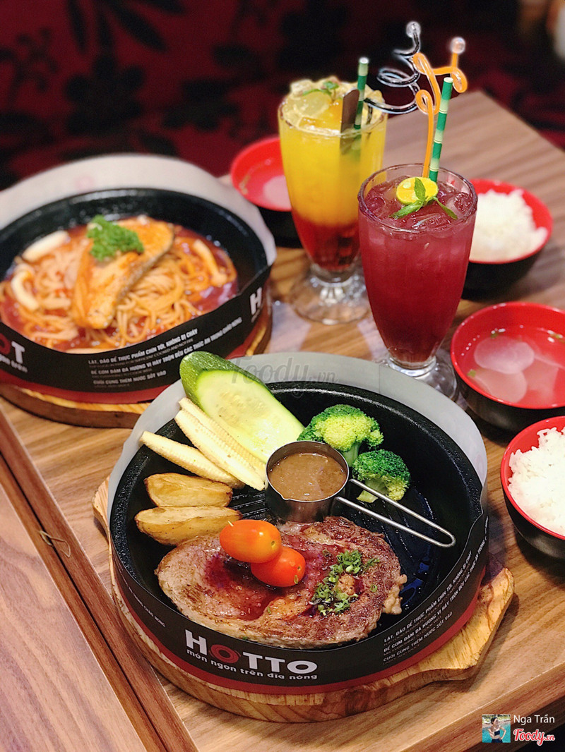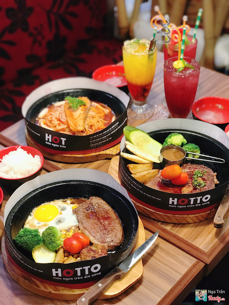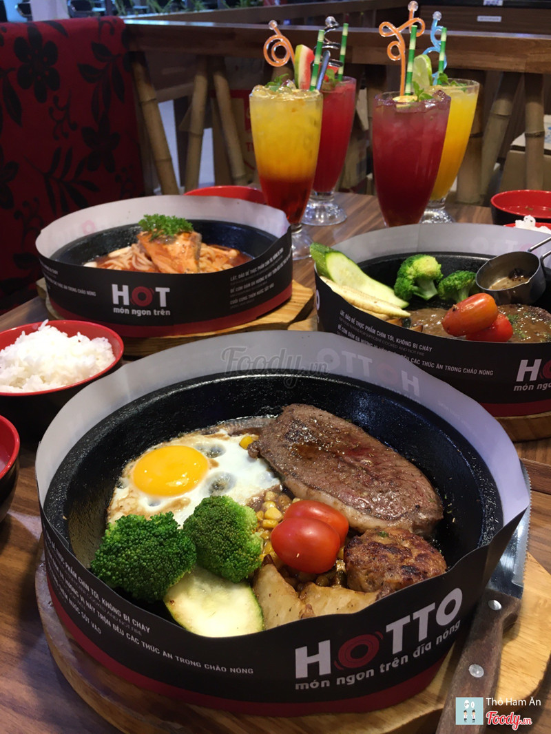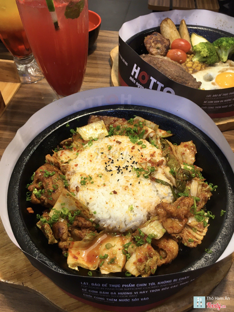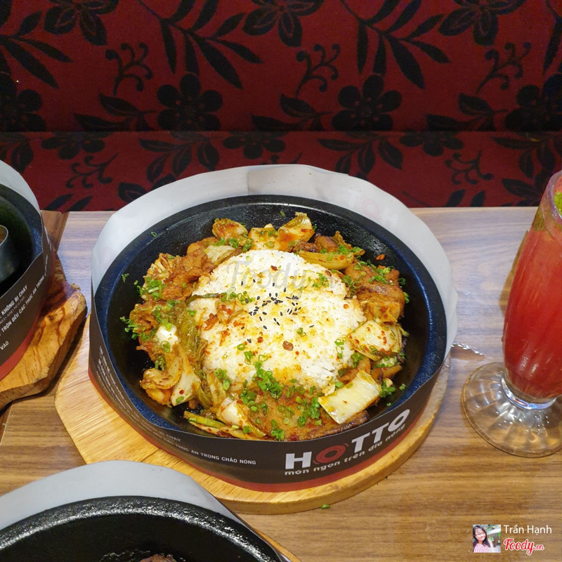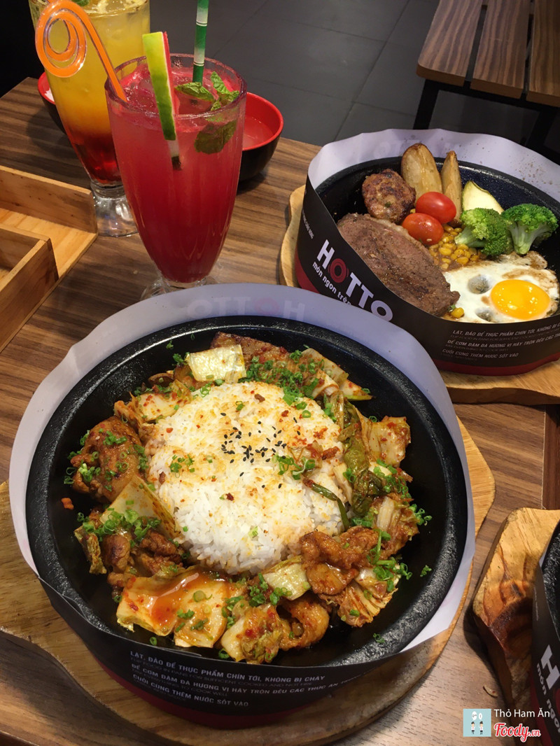 8.8Cơm trên chảo nóng.Dạo này trời mưa mà được ăn món gì nóng xì xèo thì còn gì bằng nên cả nhóm quyết định chọn Hotto. Đồ ăn nhiều, giá hợp lý, không gian ngồi lại cũng ấm cúng. Thấy món Cơm kim chi thịt heo sốt cay đang giảm còn 59k nên kêu liền. Kim chi ngon nà, chua cay vừa đủ, thịt nướng thơm như mấy nhà hàng bbq vậy đó. Khẩu phần khá nhiều chưa kể còn chén canh đi kèm nên ăn no lắm. Ngoài ra nhóm mình còn kêu thêm: 56. Bò Rib Eyes nướng sốt tiêu - 199k quả ko hổ là Best Choice 🤤 Bò mềm ko dai dù mình để chụp hình cũng khá lâu 😝 Sốt nhiều thêm tí nữa là perfect. 23. Lõi vai bò Mỹ với burger kèm khoai tây & trứng - 159k Mấy phần steak này còn kèm theo chén cơm và canh theo ngày nữa đó nha. 18. Mỳ Ý cá hồi với sốt nấm tươi - 139k món này thì sốt nhiều nè. 45. Cơm bò kim chi sốt phô mai - 99k Nước đa phần là soda với trái cây nè: _Mưa nhiệt đới _Nước ép chanh leo _Hibicus xí muội _Nước ép dưa hấu ...Xem thêm