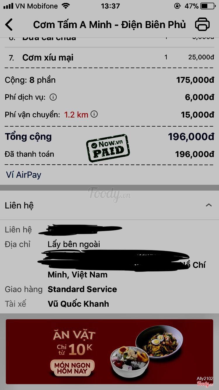 1.0QUÁN LẪN GIAO HÀNG ĐỀU TỆMình gọi giao cơm cho công ty 2 lần. Lần 1 thì quán giao tất cả các phần cơm thiếu nước mắm- nhân viên mình phải ăn cơm với nước tương, nhưng đồ ăn làm thì ok. Lần 2 bên mình gọi 8 phần cơm giao 1 phần cơm mà không giao đồ ăn- hên người không có đồ ăn là mình, người đặt hàng luôn. Khi mình gọi hỏi anh giao hàng VŨ QUỐC KHANH của Now thì anh báo để anh gọi quán và sẽ chạy qua lấy. 10 phút sau mình lịch sự hỏi anh đang đi trên đường chưa vì bên công ty em chỉ có 1 tiếng ăn cơm thôi thì anh KHANH nói là anh đang chạy qua và cúp máy giữa chừng. Đợi 40 phút sau không thấy ai nhắn tin hay gọi điện gì mình mới gọi lại một lần nữa hỏi anh KHANH thì anh nói:” ANH QUA KHÔNG KỊP NÊN KHÔNG ĐI- ANH GỌI CHO QUÁN THÌ QUÁN NÓI HÔM NAY BẬN QUÁ ĐỂ HÔM SAU BÙ.” Mình đã trả tiền qua thẻ nên ko lấy lại được thì BÙ BẰNG CÁCH NÀO?! Tại sao anh KHANH nói dối mình là đang qua quán và sau đó thì lại kêu anh không qua kịp?! Hên mình là người đặt chứ nếu trúng phần cơm của người khác họ nhịn đói hôm nay rồi mai ăn bù sao?! Tại sao không chạy qua được cũng không nhắn hay gọi lại báo mình mà để mình chờ 40 phút vì tin vào một lời nói dối?! Thật thất vọng vì dịch vụ của quán cũng như dịch vụ giao hàng! Trong khi sau khi nhận đồ ăn mình chưa kịp kiểm tra đã đánh giá cho anh giao hàng và quán 5 sao dịch vụ vì nhanh và đúng giờ. Nhưng cách xử lí của anh KHANH và quán Cơm Tấm A Minh quá tệ nên mọi người cẩn thận kiểm tra khi đặt hàng nhé! Mình cũng hi vọng Now sẽ cải thiện phần dịch vụ giao hàng hơn! ...Xem thêm