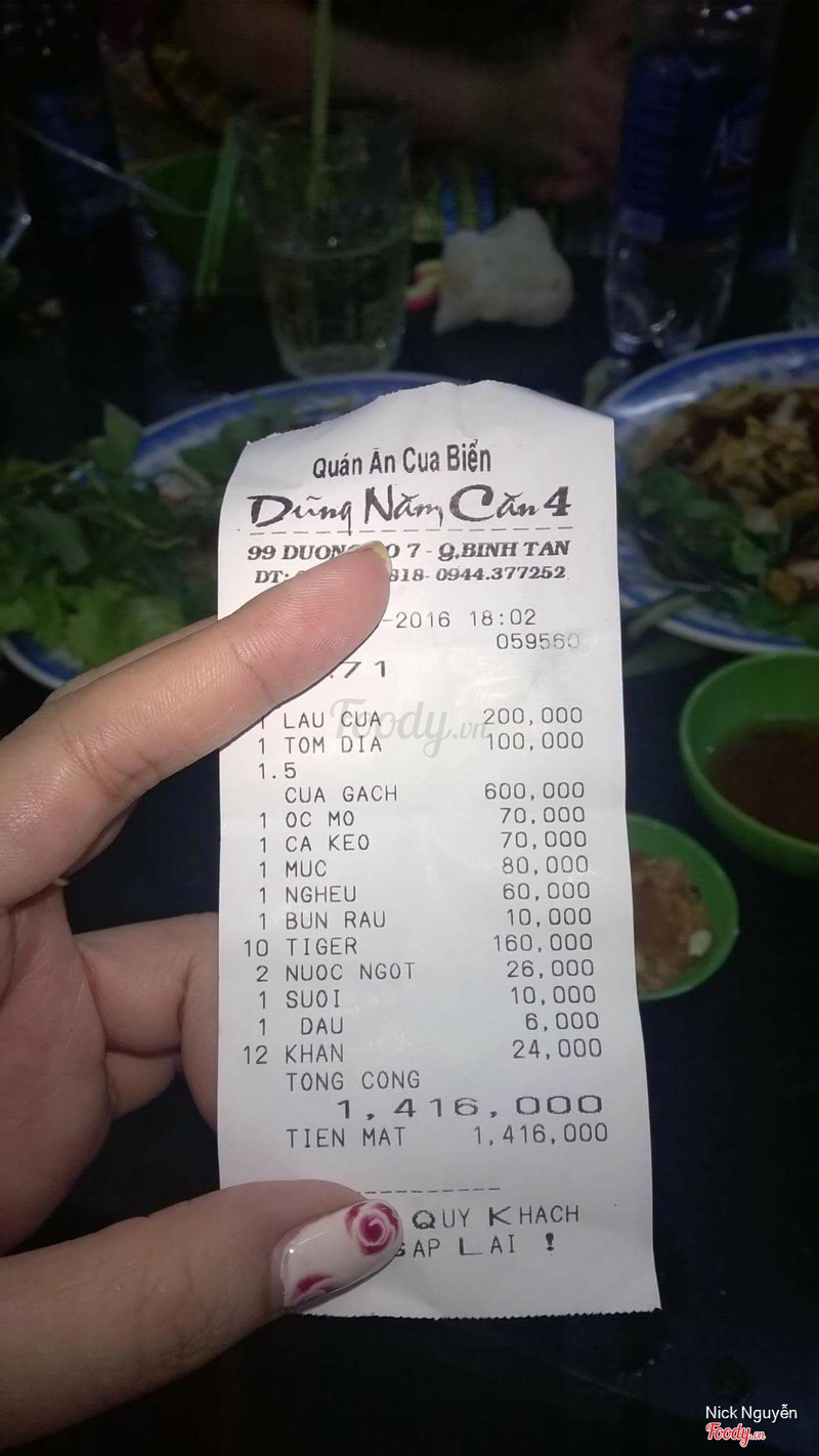 6.2Dũng Năm Căn 1 - Vành Đai TrongMình ăn ở đây từ khoảng 5 năm trước. Quán mở cửa từ 12h trưa. Cuối tuần rất đong khách. Cua ngon, chắc thịt. Có cua hấp, nướng, rang me và làm lẩu. Nước lẩu đậm đà, chua chua ngọt ngọt. Ngoài ra các món khác như ốc, nghêu, mì xào hải sản cũng khá vừa miệng. ...Xem thêm
