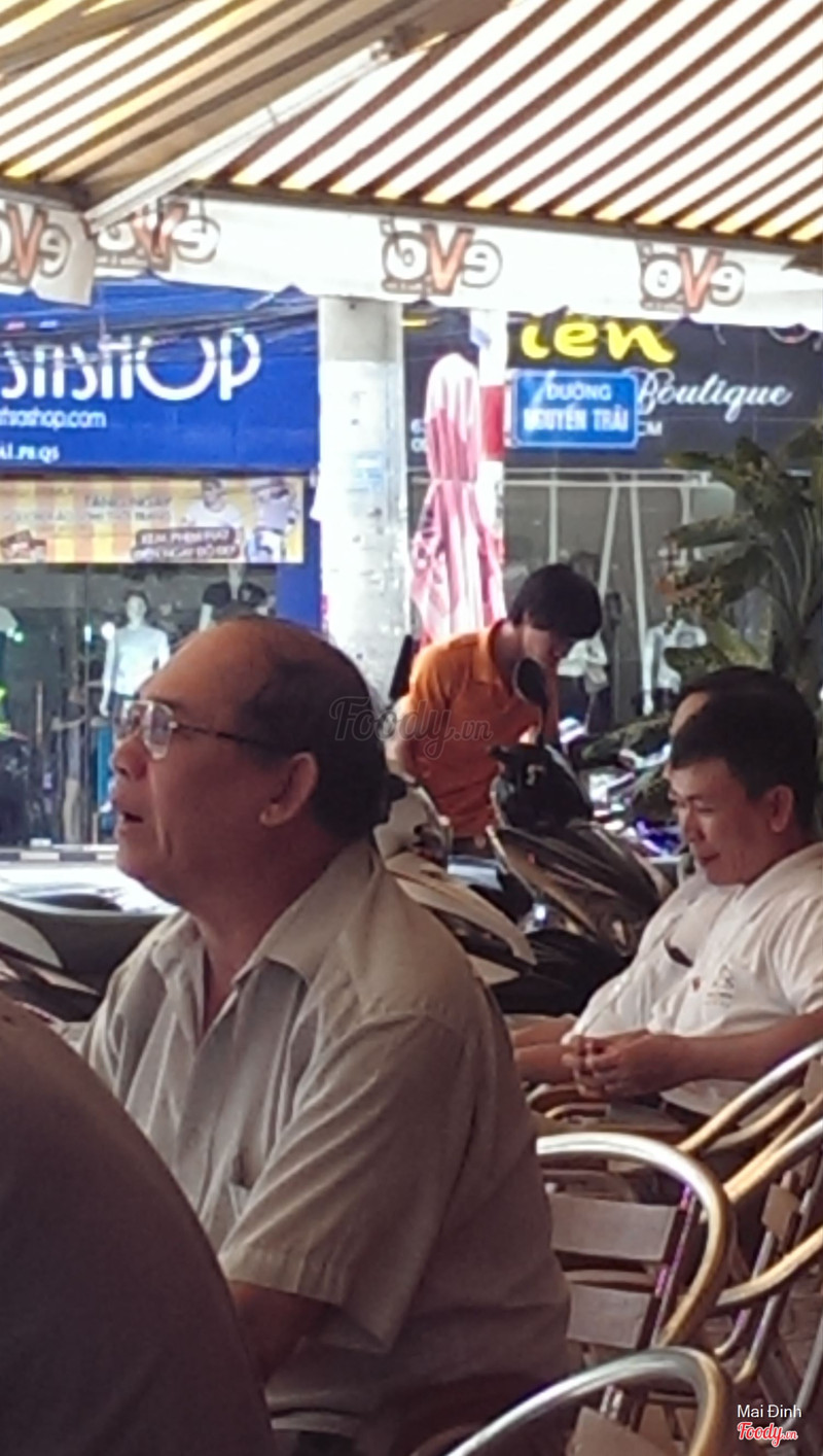 7.2Địa điểm tốt để họp mặt bạn bè, bàn công việcVào một buổi trưa thứ 7, nhóm bạn đồng nghiệp cũ lâu ngày có dịp gặp lại, mọi người rủ nhau cafe để cùng tám chuyện. Vừa chạy dọc đường Nguyễn Trãi, vừa ngó tìm quán để ghé, thì thấy 1 quán cafe có bàn ngoài trời, ngay mặt tiền và ngay góc ngã 3, thế là mọi người quyết định tấp vào. Quán nằm thuận chiều xe chạy trên khúc Nguyễn Trãi 1 chiều luôn, nên vị trí khá tốt. Quán khá rộng, ngoài các dãy bàn ngoài trời, thì còn có trong nhà và lên 2 tầng lầu. Nhóm mình đi vào buổi trưa nên còn khá ít khách. Mình order ly cam cà rốt ép, còn các anh bạn kia thì cafe sữa, bạc sỉu và cacao đá. Ly nước ép của mình khá ngon, đậm vị cam cà do không quá nhiều đá. Hỏi các bạn thì được biết cafe sữa đá tương đối ổn. Bạc sỉu thì quá ngọt, còn cacao đá thì bình thường. Mình có đem theo sẵn đậu phộng nấu, nên góp thêm phần xôm tụ cho buổi cafe vừa ăn vừa uống vừa tám đủ chuyện trời biển. :D Mình thấy quán cũng có cơm trưa, thỉnh thoảng nhân viên phục vụ bưng một vài đĩa cơm bò xào hay cơm chiên gì đó lên trên lầu. Nhìn cách bố trí bàn ghế trong nhà tầng trệt, thì có vẻ thích hợp với họp nhóm. Khi khác mình sẽ lên lầu vào buổi chiều tối xem có bàn riêng tư không. hehehe Giá nước nhìn chung không mắc cũng không rẻ, tầm 25k - 50k. Chỉ 1 điểm trừ đối với mình đó là nước trà rất nhạt, không thơm. Nhân viên phục vụ nam nữ đều có, cũng bình thường, không gì phàn nàn. Được cái châm nước trà liên tục, không đợi khách nhắc. ...Xem thêm