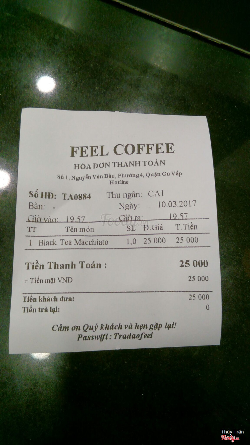 7.6Feel CoffeeQuán mới khai trương nên đang có chương trình khuyến mãi mua 1 tặng 1 đối với dòng sản phẩm black machiato . Trà đen pha lúc đầu uống ngọt nhưng lát sau khá nhạt không cảm nhận rõ vị. Lớp machiato không béo lắm. Giá 1 ly này là 25k theo mình giá này là phù hợp với chất lượng rồi . Giá khá phù hợp với học sinh sinh viên vì khu vực này gần trường học lắm . Có điều quán là dạng take away nên không có chỗ để ngồi tám chuyện được . Nhìn chung nhân viên vui vẻ , niềm nở , pha chế nhanh nữa . Vì gần trường mình, giá cả ok, chất lượng ổn nên chắc chắn sẽ ghé lại . ...Xem thêm