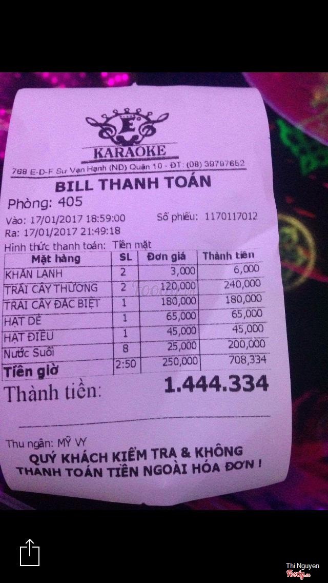 6.4Gia Đình E3 - Everyone Can Sing KaraokeNay tất niên team nên mình có cùng mấy anh chị em trong công ty ghé đây hát. Phòng cũng thoáng rộng rãi. Nhân viên mang đầy đủ hạt điều, hạt dẻ, khô mực, bánh... Mỗi thứ tínn tiền riêng. Gọi nước suối chừng 25k chai. Trái cây dĩa khoảng 120k. 1h hát là 250k. Giá cả cũng khá cao. Âm thanh không thích cho lắm. Mic hay hư mà nhạc không hay, lớn ồ ồ quá. Wifi thấy mấy cái mà không vô được cái nào hết. Nhà vệ sinh bên ngoài mỗi tầng. ...Xem thêm