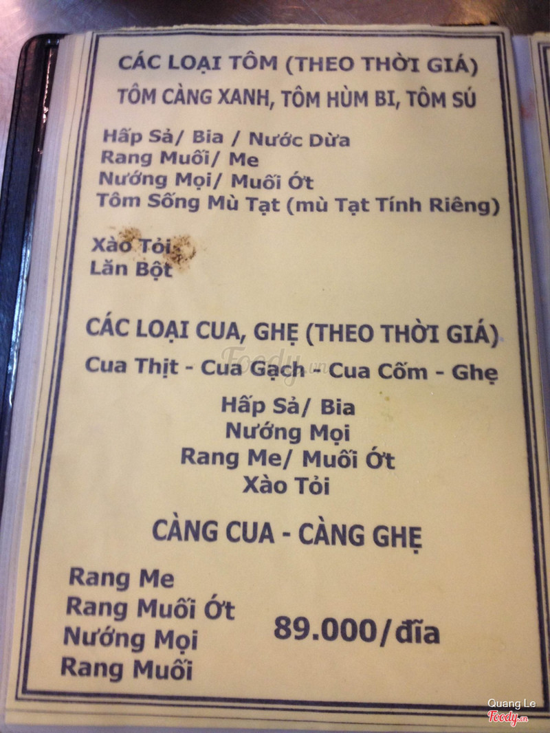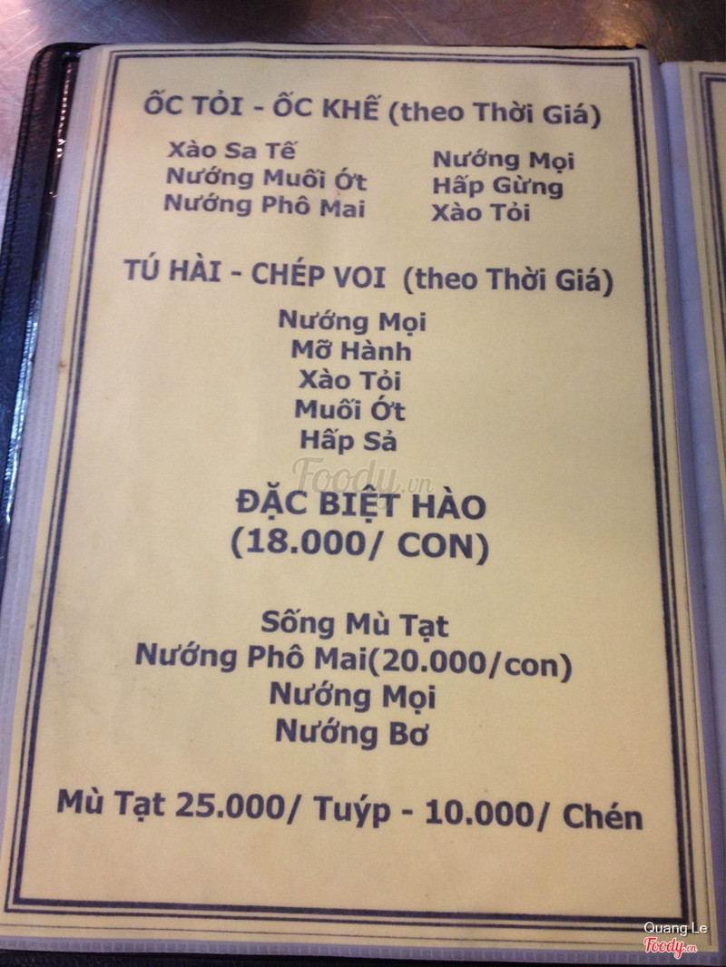7.6Ngon - Mát - Giá vừa phảiLâu lắm mình mới quay lại quán này. Quán không còn đông khách nườm nượp như xưa nữa. Chắc do quán đang sửa chữa. Ngồi trên lầu là mát nhất, gió cứ lồng lộng thổi vào chỗ ngồi. Đồ ăn thì vẫn ngon như trước. Giá cũng ok , 40 ~ 70k tuỳ món. Chỉ có giá cua hơi cao. Cua thịt 380k, cua gạch 420k. Mình thích món ốc gai nương muối ớt và món cà na rang muối ớt, cay ơi cay mà đã thiệt. Sò lông ăn rất ngon, con nào cũng mập. Có món bò da sữa chiên ăn ngồ ngộ, giong tan trong miệng. Đang có bán hào sữa chỉ có 12k/con. Chị nhân viên trên lầu cực dễ thương, lâu rồi không đến mà vẫn nhớ cả tụi mình. Sẽ còn quay lại nữa. ...Xem thêm