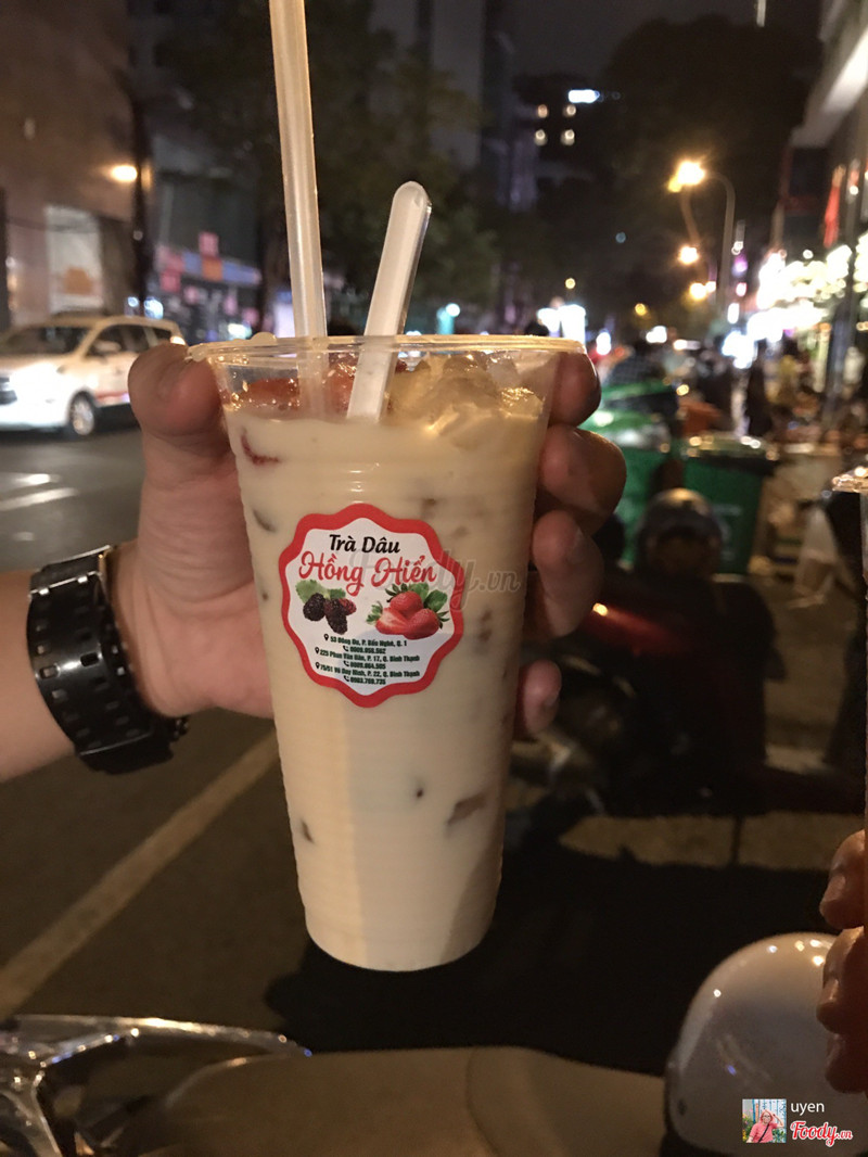 8.0TRÀ DÂU HỒNG HIỀN - ĐÔNG DU🥃 TRÀ DÂU HỒNG HIỀN ✏ 53 Đông Du, P. Bến Nghé, Q.1, TPHCM 💰 15-20k ⏰ 18:00-24:00 Tối hôm qua 2 đứa mình dạo vòng vòng Sài Gòn thì quyết định ghé vô đây uống thử. Quán ngay đối diện ks Sheraton mặt Đông Du nha. Trà dâu ở đây thì quá nổi tiếng rồi, lúc nào khách cũng đông nườm nượp, ngồi kín 2 bên vỉa hè luôn. Thấy đông phải xếp hàng vậy thôi chứ cũng nhanh đến lượt lắm nha, lúc đang xếp hàng thì sẽ có nhân viên tới hỏi rồi thu tiền trước luôn, khá tiện. Mình thấy dù đông nhưng cô chủ với nhân viên nói chuyện nhỏ nhẹ, lịch sự với khách lắm. Chỗ bán của cô chủ chỉ là mấy cái thùng xốp đựng đá, đựng ly với mấy hũ to đựng trà thôi à. Trà dâu tây với trà dâu tằm đồng giá 20k, trà lài 15k nha. Ở khu trung tâm mà giá như này mình thấy cũng khá ổn. Về vị thì mình thấy giống rượu trái cây nhiều hơn là trà, đặc biệt là trà dâu tằm )) lúc hút thử hơi đầu tiên mình xém sặc vì ko chịu nổi độ nồng và gắt của dâu tằm, nói vậy ko phải chê nha, mình nghĩ bạn nào thích uống trái cây lên men thì sẽ thích chỗ này. Trà dâu tây thì vị nhẹ hơn chút, đối với mình hơi ngọt, nhưng được cái dâu rất tươi. Nếu muốn ngồi uống tại chỗ thì sẽ có nhân viên dắt xe dùm, chỗ ngồi chỉ là 1 miếng bìa carton trải sát góc vỉa hè thôi nha. Tóm lại mình thấy vừa ngồi uống nước vừa nhìn đường phố cũng khá thú vị )) 🌞 Follow instagram @ongbagiahaman để xem thêm review của tụi mình nha ...View more