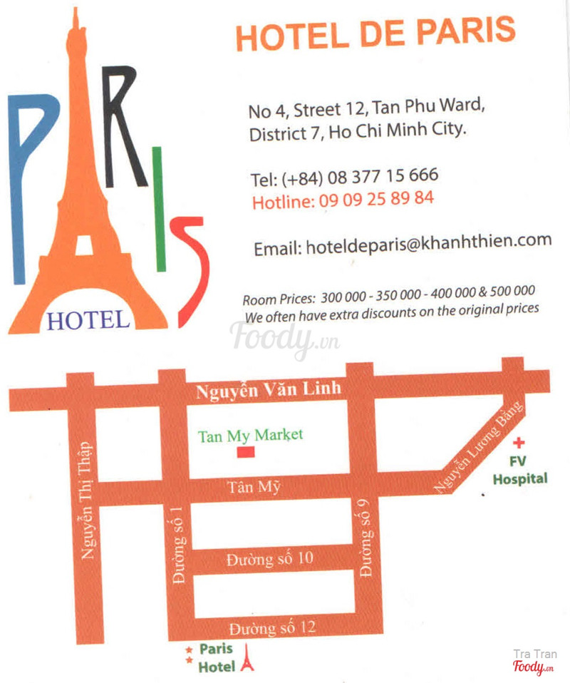 7.8Hotel De Paris23.01.2017 Hotel de Paris 4 đường 12, phường Tân Phú, quận 7, HCM Pass wifi: ks123456789 Khác sạn nằm gần bệnh viện FV (700m) nên tiện cho người nhà bệnh nhân lưu lại. Giá phòng 300k/đêm, sạch sẽ, có tủ lạnh nhỏ trong phòng, có thang máy nhỏ. Mỗi tội máy móc cũ (máy tính, máy in) - dùng nhờ hơi khó. Tầng trệt nên làm thêm tủ dồ uống để bán, tăng doanh thu. Nhân viên thân thiện. ...Xem thêm