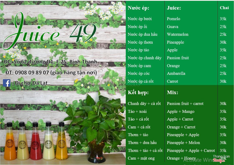 7.0Juice 49 - Nước ÉpNước ép vị trái cây tươi đậm đà vì để nguyên chất không bỏ chung với đá (đá được để riêng), 1 chai rót ra được 2 ly lận :3 hí hí Mình order 20 chai tít bên Q.7 nhưng giao hàng nhanh chóng. Bạn nhận order rất nhiệt tình dù món order không nằm trong menu :D Có dịp nhất định ủng hộ shop. ...Xem thêm