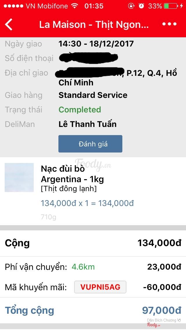 8.0Mua bằng Now AppMình cứ thấy có mã giảm giá của Now App là đi chợ ngay La Maison liền vì mình khá mê bò , mà chỗ này bán bò Mỹ giá ok , giảm giá nhẹ nữa là quá rẻ luôn . có điều hôm nay hơi loay hoay do lần đầu đặt 1 kí Lõi Mông bò Mỹ thì hết hàng , nên mình xin đặt 700gr thịt Nạc đùi bò (lần trước từng mua ăn thấy ngon nên đặt lại) . Mấy bạn bên call center Now tư vấn rất dễ thương , chủ động gọi cho tổng đài không được mình chụp bill inbox được gọi lại giải quyết liền luôn . Sẽ ủng hộ La Maison cũng như Now tiếp . ...Xem thêm