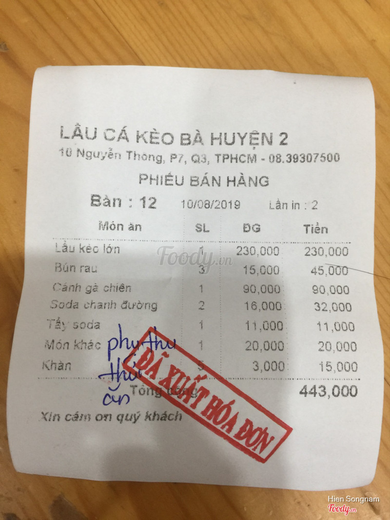 1.4Lẩu Cá Kèo Bà Huyện - Nguyễn ThôngNgoài việc thức ăn ở đây khá ngon thì chất lượng phục vụ rất tệ. Tính tiền thì ăn gian khách hàng. Mình ăn tổng bill là tầm 1tr5, nhưng lúc ra bill thì ra 2tr5 ( bill viết tay) với những món ăn đó luôn. Lần đầu tiên ra bill cả nhà mình thắc mắc nên kêu a phục vụ vô ktra lại vì cũng nghĩ là nhầm bill. Lần thứ 2 đem bill ra còn bị thêm 120k tiền rau nên thành ra bill mình là 2tr650 :)) và bảo là ktra kĩ rồi . Lúc đó bố mình khá bực nên kêu nhân viên ngồi lại tính bill với mình , thì ng nhân viên đó mới chịu xuống dưới tầng trệt in bill giấy ra với đúng số tiền 1tr470 . Bố mình bất bình hỏi tại sao như vậy thì nhân viên đó cười cười bảo tại chị kia tính sai. Mình cũng ko hiểu sao tính sai mà sai tận 2 lần :)) . Rõ ràng là lừa bịp khách hàng, vì thường thì khách hàng chỉ kiểm tra các món mình ăn ít ai mà cộng lại số tiền , cũng may bố mình nhẫm nhẫm lại phát ra ngay. Đúng là lừa đảo. Chính thức tẩy chay quán từ đây ...Xem thêm