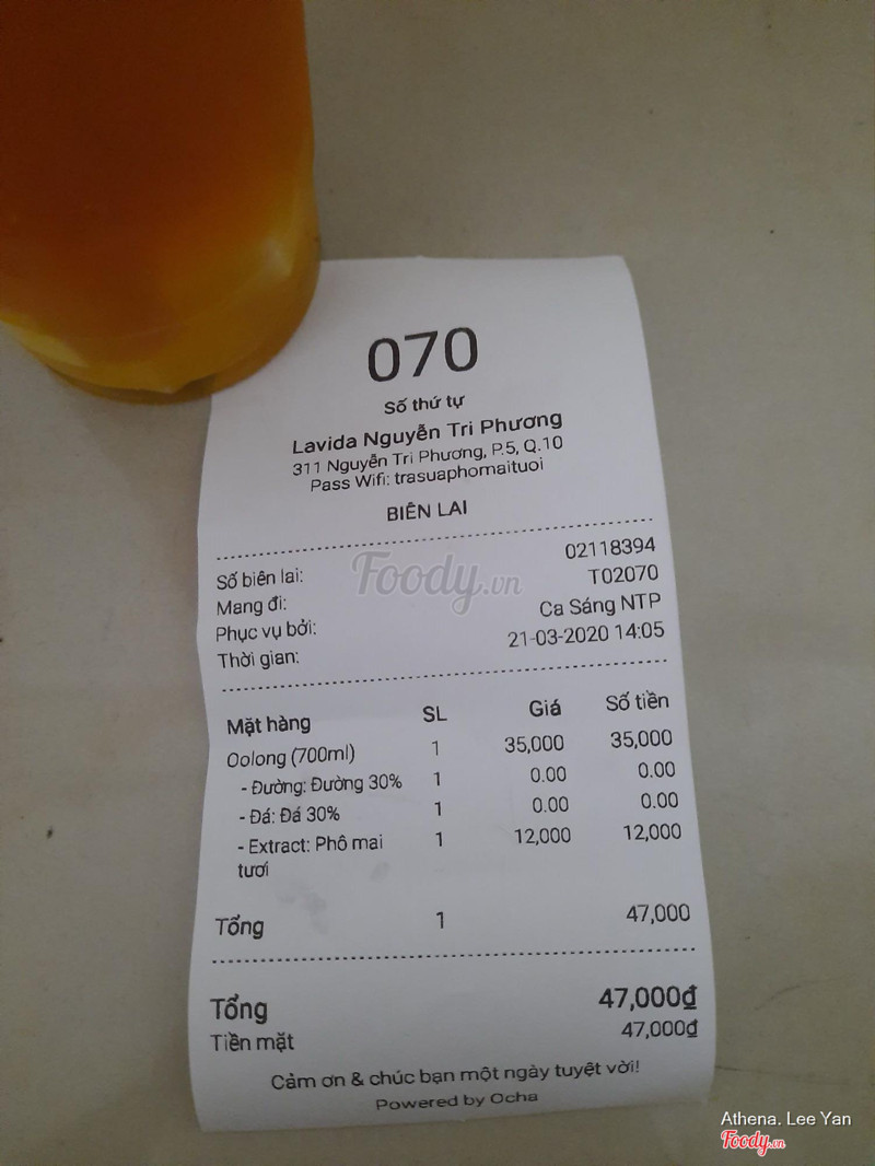 10Tà Tữa LavidaNgày trưa nắng nóng vừa mệt vừa uể oải, mình vs con bạn gù nhau order trà sữa, dạo vòng quanh apps thì thấy có Lavida đang giảm giá, thế là nhào vào order, cũng nghe khen chê nhiều lắm, nhưng kệ thử xem để biết như thế nào. Order 1 trà sữa phô mai tươi đặc trưng của quán kèm thêm topping trân châu trắng và trân châu sợi, và 1 lục trà dâu machiato mới thấy trên menu nên uống thử. Phải nói sao ta, do khoảng cách từ quán đến nhà cũng mất 20 phút chưa kể buổi trưa cũng sợ tan đá uống bị nhạt, nhưng khi giao đến đá cũng ko bị tan nhiều, uống vừa miệng nữa là đằng #, trân châu dai trắng giòn giòn , trân châu sợi thì dai dai nhai đúng sướng mồm, trà sữa thì béo ngọt thơm trà, hơi bất ngờ trong lục trà dâu machiato có sẵn trân châu trắng luôn. Lớp milk foam béo mặn, nước thì cảm nhận fresh, do mình thấy có dâu tươi nhuyễn xay. Nói túm lại là ngon hầy, lại thêm 1 địa điểm mới để order tà tữa giải nghiệp và giải nghiện cho mấy thánh cuồng rồi. ...Xem thêm