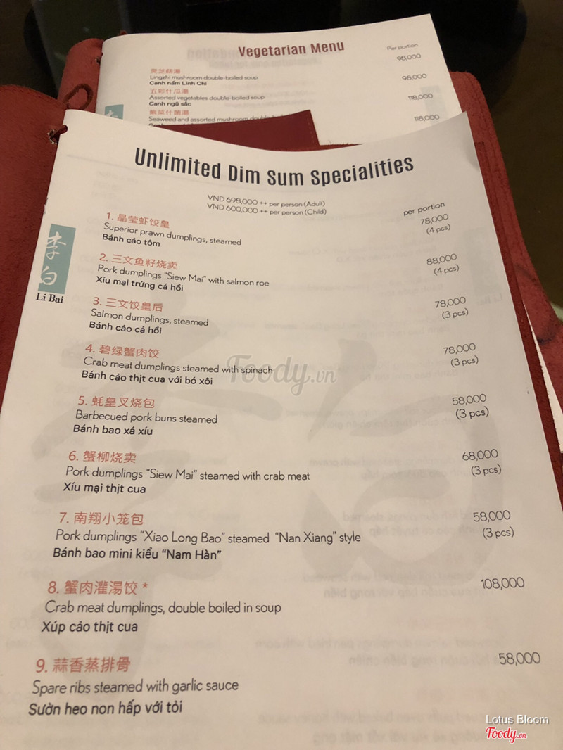 4.6Li Bai Restaurant - Sheraton Saigon Hotel & TowersThấy mọi người khen quá, tối qua mình cũng dẫn cả nhà đến ăn. Nhà mình thì sành ăn món Hoa lắm, hầu như các nhà hàng Hoa đều ghé ăn rồi. Li Bai thì không gian ấm cúng, sang. Đồ ăn 6/10. Ko ngon như mình kỳ vọng. Giá ổn, chấp nhận dc Phục vụ tạm dc, ko như kỳ vọng vào tiêu chuẩn 5 sao. Phục vụ lóng ngóng, bê nước cũng đổ, cần thêm gì chờ đợi rất lâu kiểu như thiếu nv. 1 nv mà chạy mấy bàn ko đợi lâu mới lạ... Vô 5 sao ăn thì ko tiếc tiền, nhưng tiếc miệng ăn í, gia vị nên ko tới, nói chung ko ngon như quảng cáo. Chắc tại nhà mình khó ăn 😛 ...Xem thêm