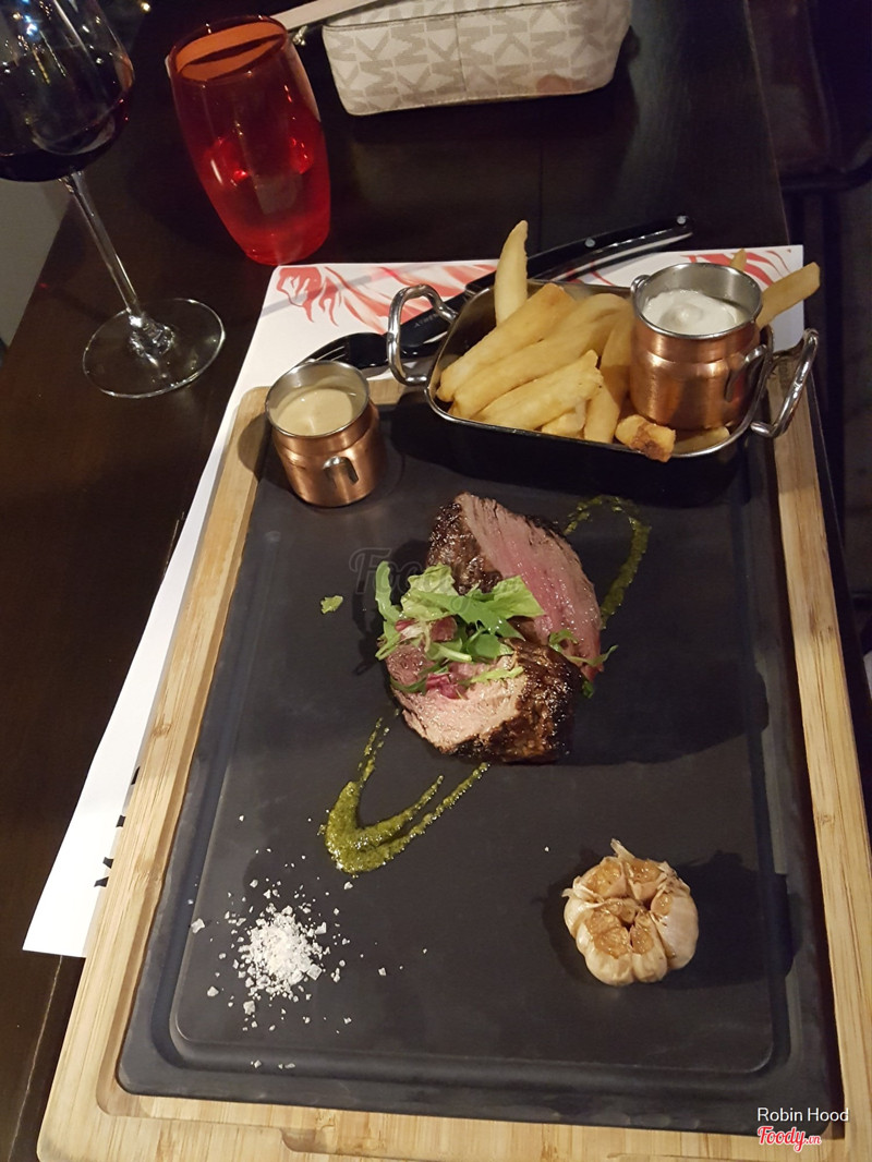 9.4Refreshing place + best meat from Australia. Highly recommend!Thể loại: nhà hàng, hiện đại, sang trọng, view trên cao, bít tết, nướng, hẹn hò, hội họp, tiếp khách Vị trí: tầng 30 của Pullman hotel. Thời gian: sau 16:00 tới khuya Không gian: sang trọng, hiện đại, ấm cúng, view đẹp nhìn ra hướng quận 4. Nhiều vị trí ngồi khác nhau. Thức ăn: Mình thấy nhà hàng chuyên về các món nướng, đặc biệt là thịt bò và cừu. Ngoài ra là kho rượu vang đỏ + trắng khá phong phú. Menu của nhà hàng rất đơn giản, chủ yếu tập trung vào các món chính + sốt + thức ăn kèm. Chú ý: phần ăn chính khá nhiều và no nên các bạn chuẩn bị tinh thần ngán thịt tới não heheheh. Thức uống: 1 chai suối size vừa 2 người. 2 ly rươu vang đỏ Paddock Shiraz vừa mới khui nắp. Rượu vang này thuộc loại light, nhẹ, mùi gỗ nồng + dâu thì phải, rất dễ uống kể cả nữ. Mình order khai vị: gỏi xoài cua lột, 1 phần thăn bò sốt blue cheese kèm khoai tây chiên và 1 phần sườn cừu sốt red wine ăn kèm khoai nghiền. Gỏi xoài cua lột: phần ăn bé xíu heheh ko quá đặc sắc. Thăn bò úc chín tái 70%: cháy cháy bên ngoài, trong còn ướt và chín, ngọt thịt, cheese để riêng bên ngoài nên ko mất mùi bò nướng. Phần ăn ~250gr nữ ăn bao no và ngán luôn. Sườn cừu nướng: gồm 4 cái xương sườn cừu + thịt hehehe. Chú ý: thịt cừu có mùi riêng biệt nên bạn nào ko chịu được mùi này thì ko nên gọi. Bên trong chín tái nên mùi cừu vẫn còn. Nhưng chấm vào sốt red wine sẽ hết. Mình đánh giá cao món sốt red wine vì mùi vị sốt rất ngon, mùi rượi, cay cay + chát nhẹ của rượu làm át đi mùi cừu và đầy vị ngọt của thịt lên cao. Nói chung là 10 điểm. Tráng miệng: kem dừa Sundae + 3 loại sốt như hình. Tùy mỗi người cảm nhận. Mình thấy ok vì trang trí khá bắt mắt, socola thơm ko quá ngọt. Đáng thử đó. Nhân viên: nhà hàng 5 sao nên sẽ được phục vụ từ A đến Z luôn. Trong lúc ăn nv phục vụ sẽ hỏi thăm thức ăn mùi vị thế nào này nọ, tư vấn cho khách món ăn phù hợp (menu tiếng anh 100% nhưng họ sẽ giúp dịch lại cho bạn hiểu, nên bạn nào ko rành tiếng anh cũng vô tư). Chỉ cần mình nhìn qua nhìn lại, là lập tức nhân viên xuất hiện để phục vụ ngay. Service 10/10 Giá cả: ở vn mình thì gọi là cao, nhưng so với giá cả ở nước ngoài thì bình thường. Tổng bill ra khoảng hơn 2t cho 1 buổi tối đắng cấp 5 sao là bình thường (m đi Sofitel gọi 1 bình trà + vài cái bánh cũng ~800k rồi). Gửi xe: Các bạn vào hầm của Pullman trên đường trần hưng đạo. Lối xuống hầm rất vòng vèo nên chạy từ từ thôi. Vào lấy vé xe bấm thang máy lên lầu 30. Phí gửi 5k. Bạn nào vào từ cửa chính thì hỏi tiếp tân. họ chỉ dẫn còn rõ nữa :) Ngoài lề: 1. Bạn tìm 1 nơi sang chảnh để phục vụ mục đích hẹn hò, cầu hôn, tỏ tình....thì nên lên thử. 2. Không gian quán nhẹ nhàng, rất phù hợp cho couple hoặc gia đình. 3. View trên cao khá đẹp. 4. Chuyên bò Úc, bảo đảm tín đồ mê thịt đỏ nên thử vì cái vị món ăn y như ở nước ngoài luôn. 5. Món nướng nên chờ hơi lâu khoảng 30 phút. 6. Giá cả phù hợp cho cả chất lượng thức ăn + không gian + phục vụ. 7. Vị trí trung tâm. 8. lầu 31, đi bộ từ mad cow lên là rooftop bar khá chất, toàn là người nước ngoài. 9. môi trường 5 sao nên mọi người chú ý ăn mặc phù hợp. Bạn ko bik tiếng anh cũng ko sao, vì người Việt phục vụ nhau mà :) 10. Mong xem review của các bạn về nhà hàng này. ...Xem thêm