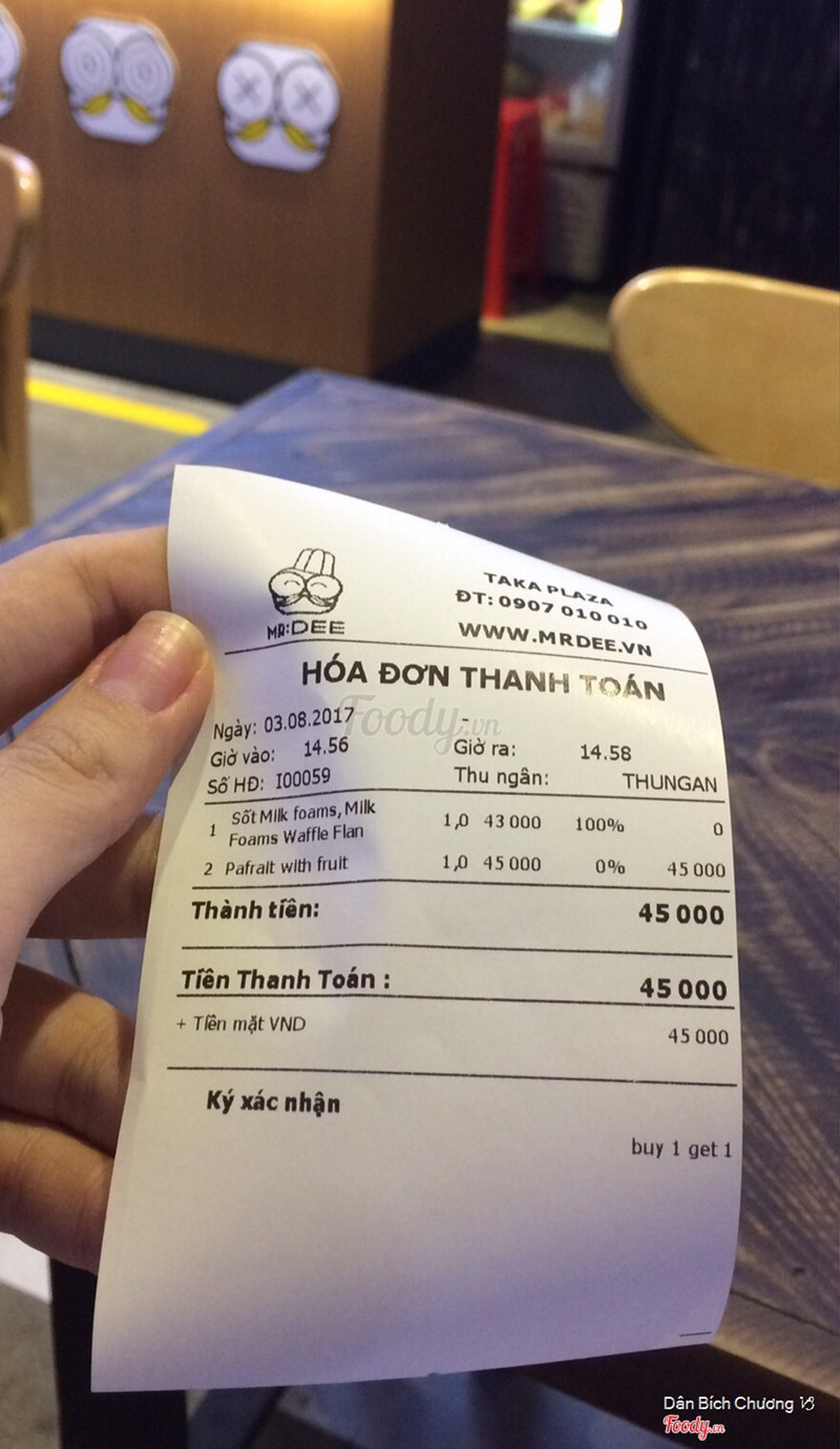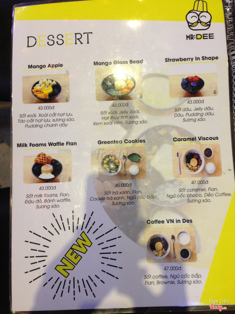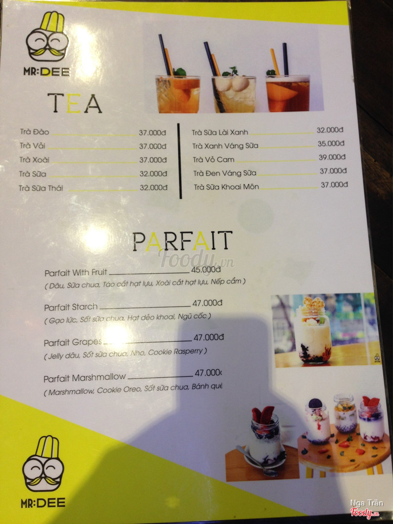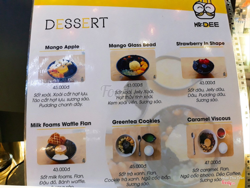7.6Parfait with fruit NGON, bị dột máy lạnhCó voucher mua 1 tặng 1 từ Express Now nên tranh thủ đi liền cho nóng vì gần đây , từ cầu thang thì thấy ngay màu vàng của Mr. Dee liền , có 2 bạn nam phục vụ dễ thương lắm , tư vấn nhiệt tình . Mình đi với bạn mà không kịp cản nó gọi milk foams waffle flan 43k do đứng gần nhân viên nên kệ , lát dụ ăn flan cũng ok . Mình chọn Parfait with fruit 45k , trong menu không thấy ghi kiwi mà cũng được 1 miếng . Khá ngon có điều nếp cẩm bị dính cứng phía dưới , mà nó ép thành ly chứ không đầy như bên ngoài nha 😂 cảm giác bị lừa nhẹ . À bị dột nước từ máy lạnh hay sao đó , ngồi nửa tiếng dột đúng nửa tiếng 🤧 điểm yếu duy nhất là... waffle luôn bở mềm , không giòn hay thơm bơ xíu nào . ...Xem thêm