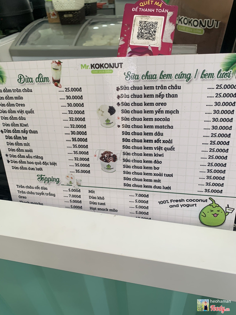 8.8Mr Kokonut - Chè Dừa Dằm - Vạn KiếpGHÉ MR.KOKONUT LÀM TÍ SỮA CHUA TRÂN CHÂU HOYYYY NÀOOOO 👏 Mr.Kokonut 🏠252 Vạn Kiếp Quận Bình Thạnh Đi ngang quán này nhiều lần rồi mà chưa có dịp ghé dô, hđó Mama nói thèm nên mình đèo dô ăn luôn rồi có dịp thử 😉 Với vị trí khá thuận lợi là nằm ngay con đg ăn uống bao la ở Bình Thạnh 🤘Không gian decor các thử thật sự rất mát con mắt nha, phù hợp với những ngày hè nóng nực bay dô làm ly chè hay sữa chua. Quán k có lầu tất cả khách ngồi ở trệt hết, khgian cũng chia ra làm 2 là bên trong và ngoài. Mà thường đi bạn bè đông đông ngồi ngoài có vẻ thích hơn á 👍 Cô chú giữ xe khá dễ thương lại tinh ý và chu đáo lắm, nhớ mặt dắt xe ra liền chưa kịp đưa thẻ 😉 Mình thử 1 loại sữa chua và 1 dừa dầm ăn coi sao vì đây cũng là lần đầu mình dùng sữa chua kiểu có trchau vậy. Còn dừa dầm thì mình ăn quài nên k bở ngỡ đâu :)))) Dừa Dầm Trân Châu là món đặc trưng và khá truyền thống nhỉ. Món này Mama mình ưng lứm vì cái cốt là Mama mình thích cái độ béo của nc cốt dừa của quán. Mama nói khá ok và cảm nhận đc vị nc cốt dừa bửa đó khá fresh luôn nha. Trân châu trắng mềm dẻo và cộng thêm khá nhiều em dừa non best lứm. Nhưng khi trộn đều vào nhau thì món này khá nhạt nha nên là bỏ ít đá thôi. À mình thì lại ưng cái phần dừa khô bên trên á, đảm bảo cũng khá tươi mới nha vì mình ăn k bị cảm giác dầu gắt ở cổ 🥳 Sữa Chua Trân Châu là món mình gọi. Mà cũng khá hụt hững thôi vì k hấp dẫn như hình quảng cáo :))) Mà thôi cũng ăn thử coi sao ;)) Trước khi ăn nhỏ đổ em trchau vớinuowsc cốt dừa thì phải, vào sữa chua nhé. Sữa chua ở đây có vị chua nhẹ, mùi sữa khá ít và dễ ăn nhưng để nghiện thì chưa thấy gì đb với mình. Với cái topping là trchau trắng vẫn cứ mềm dẻo như nhận xét bên trên. Tóm lại mình thấy cũng dễ hiểu vì s dạo này món sữa chua trchau khá lên ngôi. Thứ nhất mình thấy giá cả tầm chung của món này hợp lý đấy chứ. Thứ 2 dễ ăn, k cần quá cầu kỳ lại cực fresh luôn. Mà thứ 3 thay gì ăn sữa chua truyền thống như ở nhà Mama làm hay mua hủ sữa chua ở siêu thị thì tại quán lại có kha khá topping để add vào cứ như ún tà tữa ý. Hợp lý 🔥🔥 Đây là ý kiến cá nhân của mình, bạn hãy đến và trải nghiệm rồi hashtag #bigmoutheatmore chia sẻ cùng mình với nhé 😝 ...Xem thêm
