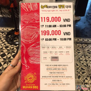 1.0TệBuffet 199k chưa Thuế. Chỉ có ba rọi heo, bò vụn và gà. Tương chấm siêu dở. Quán hàn mà panchan chỉ có kimchi và củ cải trắng. Đồ ăn phụ tệ, thố trứng 1 muổng là bỏ luôn không ăn nổi. Chưa kể ăn về bị đau bụng nguyên đêm. 1 lần dại dột thử mà quá là ân hận. Giá luôn nước 250k 1 người thì quá tệ so w Kingbbq hay Kpub. Thố canh ở giữa để sẵn hết trên tất cả các bàn khi chưa có khách rất mà mất vệ sinh. ...Xem thêm