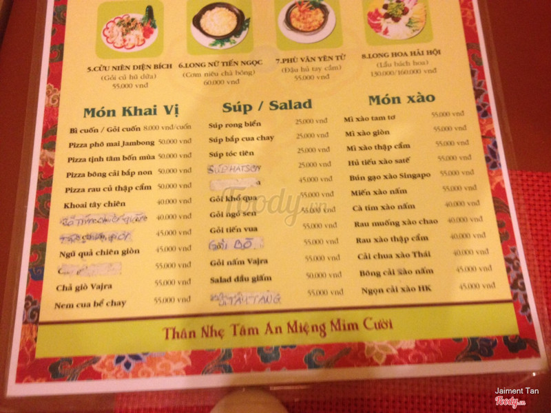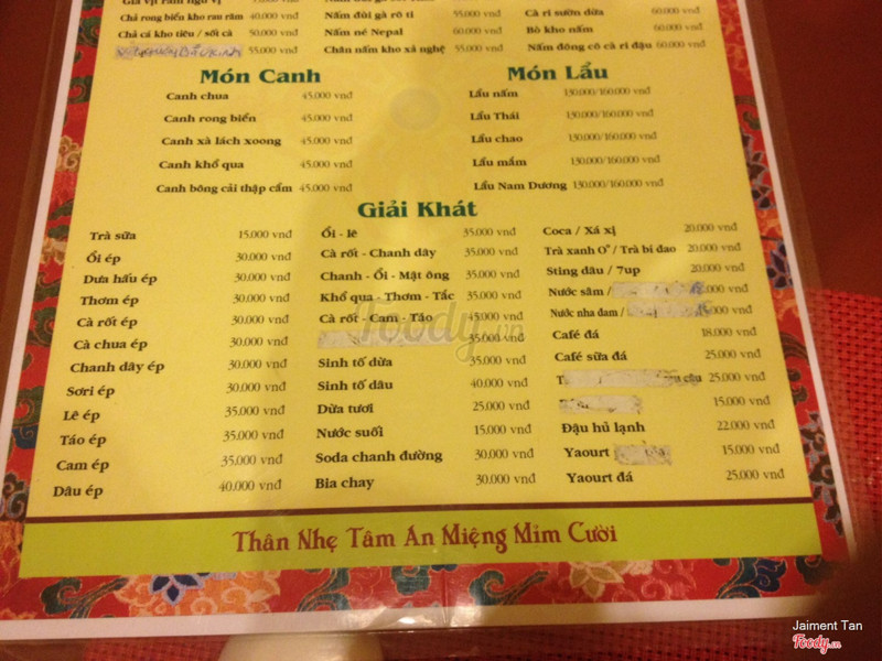 6.2Nhà Hàng Chay Vajra - Lão TửLần trc có dịp ăn ở LHP thấy ok nên hnay dẫn mẹ đi ăn nhưng sao thấy món ăn hôm nay mặn wa haizz nước ép táo hình như có bỏ đường thêm nên quá ngọt. Ngồi ở tầng trệt nên có cảm giác ko thích lắm ko co nhạc máy lạnh thì ko mát mà vừa bước vào có mùi hôi do chưa dọn bàn sạch sẽ haizz tóm lại lần sau chắc sẽ ăn ở LHP ...Xem thêm