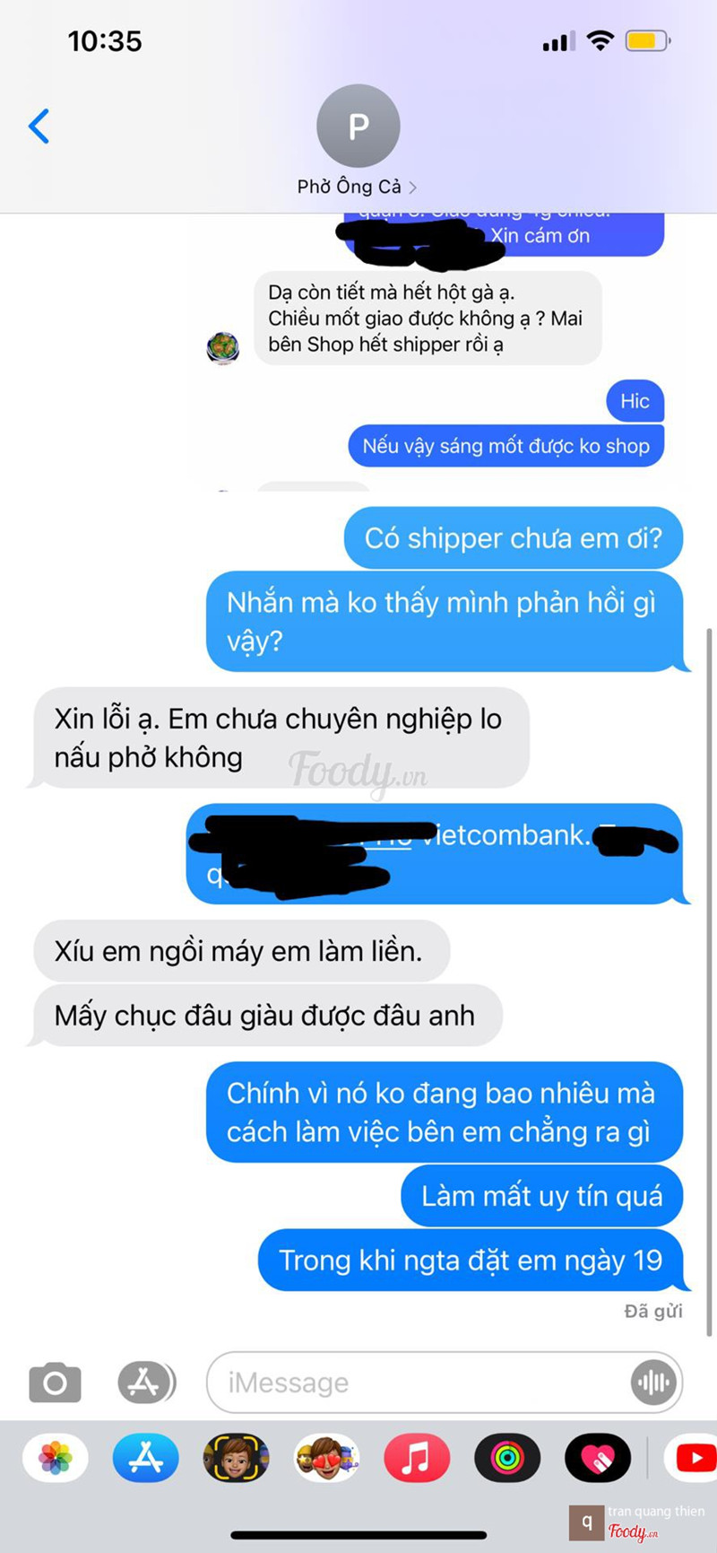 3.2Quá thất vọng.Mình lần đầu tiên bực trong việc ăn uống đến vậy. Mình cũng thường ăn quán này, (PHỞ ÔNG CẢ 66b***- p4 - q3) nhưng nay làm mình quá thất vọng. Đặt món từ ngày 19 Tây. Thống nhất là sáng 21/7 này giao tầm 7 đến 9 giờ sáng. Nên sáng nay mình kỹ và còn nhắc lúc 7g15. Thế méo nào nay gọi gần chục cuộc gọi đều nói em đang chờ shipper. Không thì anh hủy đơn đi (trong khi đã chuyển khoản thanh toán ngày 19). Rồi quán mới kêu mình đợi tiếp. Đến gần 10g mới giao. Nhưng trên thực tế kiểu như quên vậy. Rồi giao đồ ăn thì ko giống ai. Như kiểu cho mình tự làm vậy, rau ko rửa, rồi quăng cho mấy củ hành và sả vô chưa rửa luôn, giao đồ ăn thì thiếu các kiểu. Moá nói chuyển hoàn mình phần thiếu mà đợi Hoài ko thấy, nó ko đáng bao nhiêu nhưng rất ghét kiểu làm ăn này😡😡😡😡 ...Xem thêm