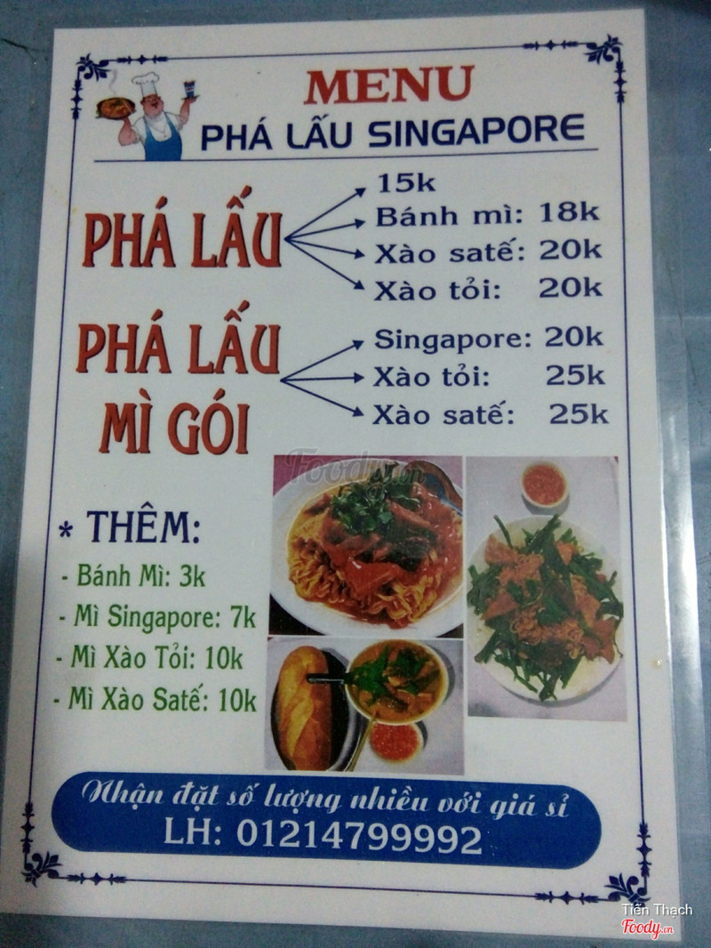 9.4Phá Lấu SingaporeNay quán có Menu hẳn hoi. Tới đây ăn mí lần toàn ghiền món phá lấu mì gói. Lần nào cũng 2vắt mì, nước chấm ngon qá cho nên cứ xin thêm. Phá lấu cắt vừa ăn. Nay có thêm món phá lấu xào sa tế ngon, đậm đà. Đặc biệt sa tế cay cay nồng nồng. Trời mưa vô ăn là hết bài lun. Cô chủ rất nhiệt tình. Kế bên là có bún thịt nướng, gỏi cuốn và có bán nước uống lun nhé. Giá cả rất ok 👌👌👌 ...Xem thêm