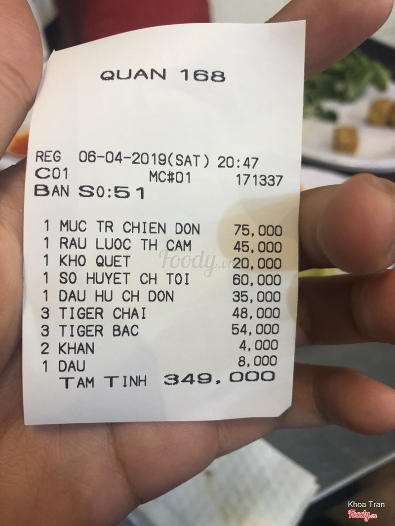 8.0Quán 168Quán này dễ tìm, khá gần ngã 3 Thành Thái - Bắc Hải. Quán nhậu bình dân nên không gian mình thấy cũng bình thường, chỉ là đông khách thôi. Có giữ xe nên an tâm, dù vẫn bị tính phí nhưng không sao. Món trong quán giá từ 40k đổ lên nha. Nói chung đồ ăn cũng ổn, khuyến cáo kiếm bàn ngồi gần đường cho mát và đỡ ồn! ...Xem thêm