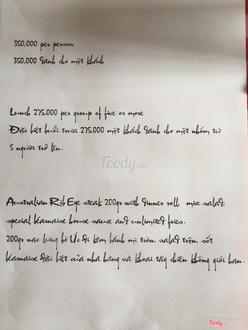 7.2Gặp người nổi tiếngTheo mình thì đồ ăn cũng chỉ bình thường thôi. Một phần do mình không thích ăn steak lắm đi chỉ vì bạn rủ. Theo ý mình thì đồ ăn ok, nước ok, giá mắc quá. Mà giá mắc thì phục vụ phải tốt thôi, siêu ân cần luôn khúc cuối còn có quản lý ra hỏi ý kiến rồi cảm ơn. Dù không thích đồ ăn lắm nhưng có thể mình vẫn sẽ quay lại vì phục vụ thật sự rất dễ thương. Chỉ là chỗ rửa tay tối khiếp biết là style của quán nhưng thực chỗ rửa tay tối thui tối mò luôn. Điểm mấu chốt là lần đi ăn ở đây mình gặp trúng anh hay làm ảo thuật đường phố Petey Nguyễn hay gì đó k biết nhớ đúng tên k nhưng mà mình nhớ mặt ^^ ...Xem thêm