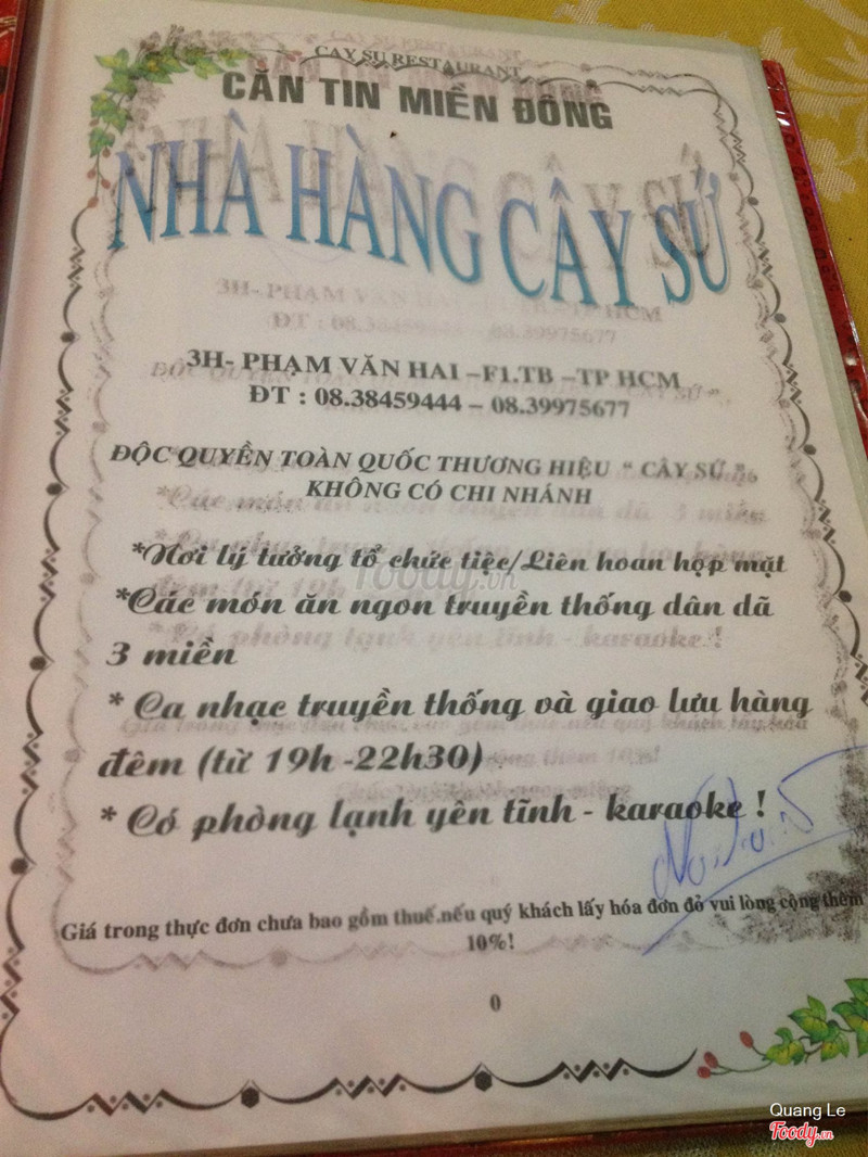 7.2Bình thườngHồi bé mình hay qua bảo tàng chơi chứ ăn ơ cây sứ ngay cạnh ít lắm lại còn nhỏ nên không nhớ rõ.Lần này đi ăn có ấn tượng rồi:) nhà mình đặt một phòng riêng bên trong,không gian khá bí ,vẫn có tiếng ồn từ "hát với nhau "ở ngoài .Vì vậy không được thoải mái lắm.Về món ăn,gọi món đặc sản là bê thui mà sao không thấy ngon,dai,thịt nhạt nữa.Các món súp,cháo bồ câu,đậu hũ ăn được.Gỏi xoài, bò nấm kim châm,cá hấp ngon lắm.Bò mềm ,ướp đậm vị,cá chắc ngon,xoài giòn chua chua.Nấm kim châm nướng hơi bị cháy.Không gian sân vườn ,không được trang trọng nếu mời khách,chỉ gia đình,bạn bè thôi.Nhân viên cực kỳ thân thiện,tận tình.Có điều nhà vệ sinh khá là tệ:( ...Xem thêm