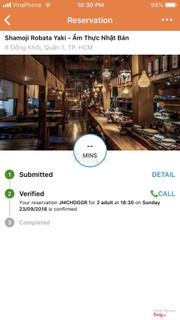 Đây là xác nhận đặt bàn của mình qua Table Now, đến giờ vẫn không complete, vì nhà hàng này không nhập vào hệ thống, không giảm giá cho mình.