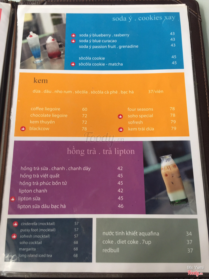 6.8Soho Lounge Cafe - Phú Mỹ HưngQuán không nằm dọc hồ bán nguyệt mà hơi rẻ vào hẻm xíu, có cả khu ngoài trời và phòng máy lạnh cho từng sở thích. Mình đến vào buổi trưa nắng nóng nên chui vào bên trong. Bên trong cũng có 2 khu, bên đen và bên trắng, các salon với thành cao tạo thành vách ngăn từng nhóm người, tuy nhiên cũng không riêng tư lắm và hơi ồn. Ồn nhất là các bạn nhân viên, người đầu này kẻ đầu kia đùa giỡn hết sức ồn. Nhân viên phục vụ cũng không vui vẻ mấy đâu. Nhân viên đặt ly trà đá xuống, mình nói đổi giúp mình ly trà không đá, mặt lạnh như cụt đá bạn ấy rinh đi thẳng không trả lời. Làm mình hoang mang không biết được đổi hay không Về thức uống, ghi công dụng hay hay. Nhưng uống thì không có gì đặc biệt. Giá cho 1 khu thế này thì cũng bình thường không đến nỗi quá đắt. Nhà vệ sinh thì phải lên lầu, đi 1 đoạn hơi xa. Nếu bạn ngồi cafe 1 mình mà muốn đi vệ sinh chắc là nên đi luôn, chứ lượt đi lượt về mất 10p hơn nhân viên dọn sạch bàn rồi. ...Xem thêm