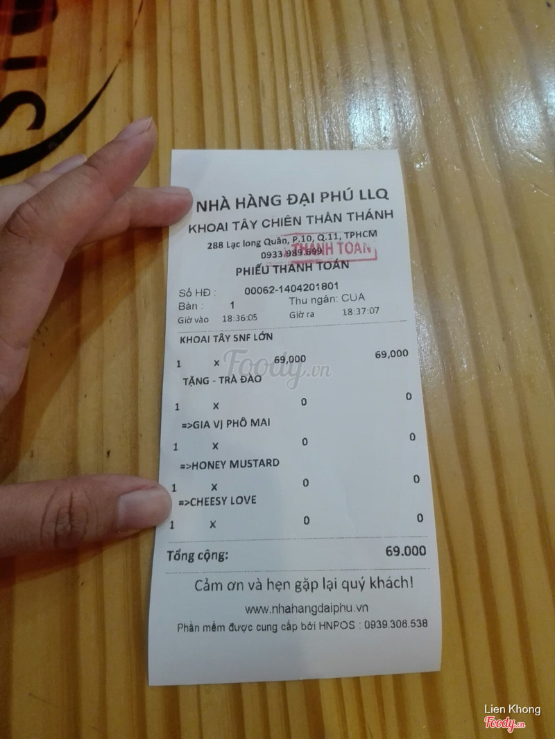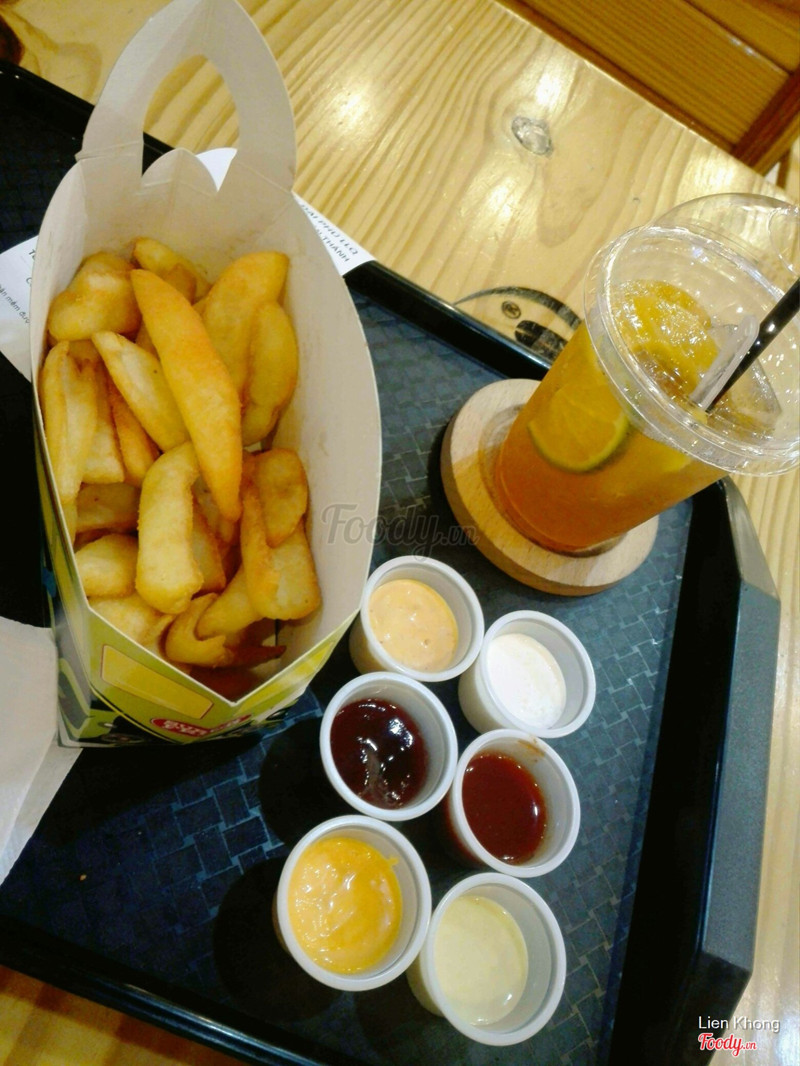 7.6Khoai lắc chấm sốt độc đáoQuán nằm ngay vòng xoay Ông Ích Khiêm - Lạc Long Quân. Không gian sáng sủa, mát mẻ, nhiều bàn ghế. Giữ xe miễn phí. Ngoài quầy order bên trong cho khách dùng tại quán thì bên ngoài cũng có sẵn 1 quầy để khách có thể tiện ghé mua take away. Mình mua 1 khoai tây SNF lớn 69k, hôm đó có khuyến mãi được tặng thêm ly trà đào. Phần khoai lớn được chọn 1 loại gia vị rắc lên khoai và 2 loại sốt chấm. Tổng cộng có 4 gia vị (original, gà cay, rong biển, phô mai) và 6 sốt chấm (cheese love, curry, mayo, bbq, honey mustard, spice cheese) để lựa chọn. Khoai không giòn lắm nhưng miếng to, hình dạng là cái ván lướt sóng khá đặc biệt :)) Trà đào uống ngon, có luôn cả xác đào dầm và đào miếng. Nhân viên vui vẻ, nhanh nhẹn và mình thấy luôn có ít nhất 1 bạn đứng để quan sát khách hàng có cần gì hay không, rất chu đáo. ...Xem thêm
