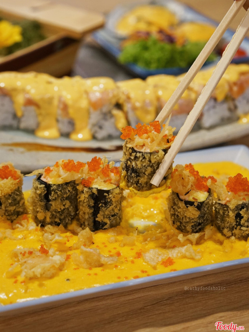 9.0Ngon rẻ🍥Cơm cuộn cá hồi bơ trứng sốt phô mai 85k một cuộn khá to nghen, miếng trứng và bơ được xắt vuông vức chất lượng, cuộn với 1 lớp rong biển bên ngoài là cơm, lớp cá hồi trên mặt phủ đầy sốt phô mai beo béo mềm mịn siêu hấp dẫn. 🌟Cuộn hải sản chiên giòn sốt trứng muối 95k cuộn này xuất sắc hơn do có sốt trứng muối béo bùi mằn mặn ăn kèm, cộng thêm độ giòn rụm của rong biển được chiên khiến người ăn dễ dui dẻ lắm. 🍣Sashimi tui gọi riêng từng loại từ 70k-85k mỗi loại 5 miếng, thịt cá hồi tươi béo, cá trích ép trứng và sò đỏ săn sần sật, chấm ăn kèm với nước tương mù tạt và gừng đỏ ngâm chua ngọt. ...Xem thêm