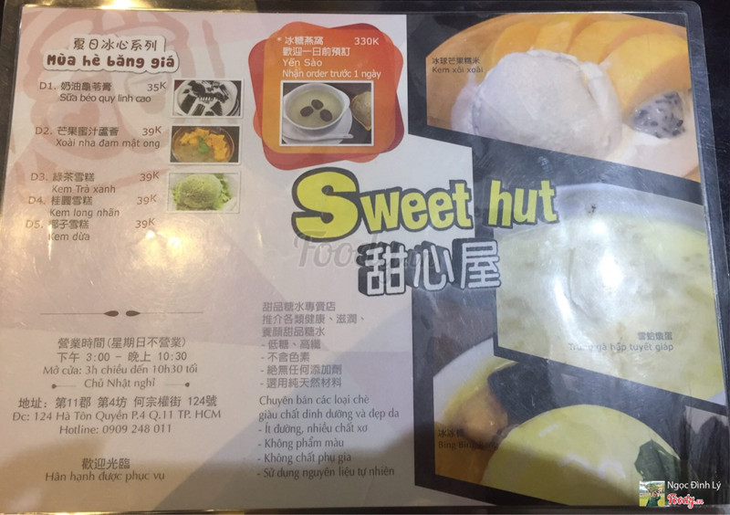 7.4Sweet Hut - Ngôi Nhà Ngọt NgàoNếu nhắc đến Quận 11 thì ắt hẳn mọi người sẽ nghĩ ngay đây là một trong những quận nhiều hàng quán nhất, nơi những con dân “nghiện” ăn vặt thường hội tụ, và nổi bật hơn cả có lẽ là là con đường Hà Tôn Quyền nổi tiếng với những quán sủi cảo lúc nào cũng đông đúc cùng những tiếng rao mời... thì mới đây, góp mặt vào sự nhộn nhịp đó, đã xuất hiện một quán chè HongKong mang một màu sắc khác biệt hơn, lạ hơn. Không gian quán thì cũng bé thôi nhưng sạch sẽ, thiết kế tạo cảm giác khá ấm cúng, thích hợp để đi ăn cùng gia đình nè. Thái độ nhân viên phục vụ cũng rất dễ thương luôn, nhiệt tình lắm. Lúc về thì hướng về nhà mình đang sửa chữa ở đầu đường thì được anh nhân viên nhắc trước để quay xe trước đỡ phải chạy đến đó rồi mới vòng về, khách ăn xong là tiễn ra cửa mở cửa luôn nè. Quán do một hướng dẫn viên du lịch mở và cũng là gốc Hoa, nhân viên thì có vẻ là người Hoa hết ấy, nên mình nghĩ là về mùi vị cũng khá chuẩn nha, giá cả thì có với một số món là hơi cao. 1. Xôi nếp than xoài: mình thì không thích ăn xôi nếp than lắm nên không bình luận nhiều, nhưng về phần xoài thì là xoài cát luôn ạ, siêu ngọt luôn. Ăn thích lắm. 2. Trôi nước đậu phộng: món này thì mình thấy lạ do đó giờ chỉ ăn qua đậu xanh ấy. Lớp vỏ mỏng, mịn. Phần nhân thì cảm giác như kẹo đậu phộng ấy, ăn khá lạ miệng. Một chén có 5 viên to, vài viên nhỏ (không nhân) nhưng theo mình thì nên 2 người ăn 1 phần này vì mình ăn 2 viên là khá no với có tí ngán. 3. Chè tuyết giáp: với ai gốc hoa thì chắc không xa lạ gì với món chè “dưỡng nhan sắc” này nhỉ, với người hoa thì độ tốt cho da của món chè này chỉ xếp sau tổ yến thôi. Thì mình đánh giá khá cao món này ở đây, vì tuyết giáp phải chế biến khá phức tạp vì nếu không sẽ để lại mùi tanh thì ở đây là tốt hoàn toàn. Phần sữa tươi nấu cùng cũng không quá ngọt hay ngọt gắt cổ mà nó theo kiểu béo béo, thơm thơm. 4. Trứng gà hấp sữa tươi: món này về cơ bản thì nó khá giống bánh flan nhưng không có phần caramel, mà khác là sẽ ngon hơn nếu ăn nóng, nhưng nếu ai không thích ăn ngọt quá thì ăn lạnh sẽ át được vị ngọt hơn nha. Món này ở đây làm vị ăn ổn nè, trứng hấp ra siêu mịn luôn, ăn thích cực kì. ...Xem thêm